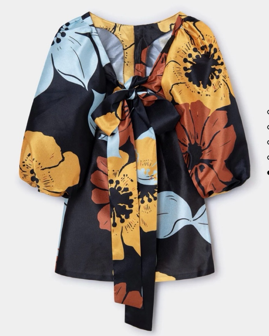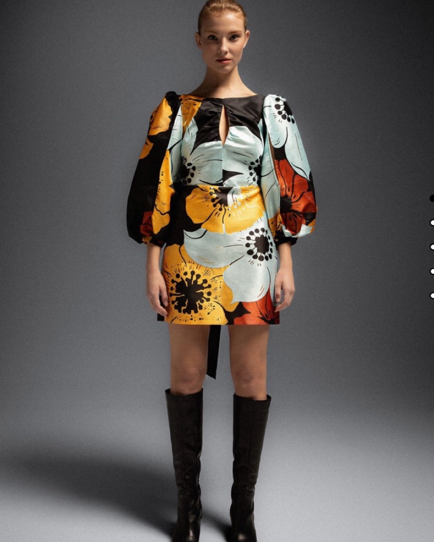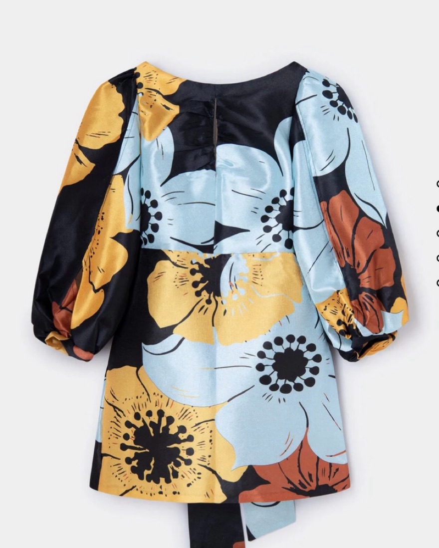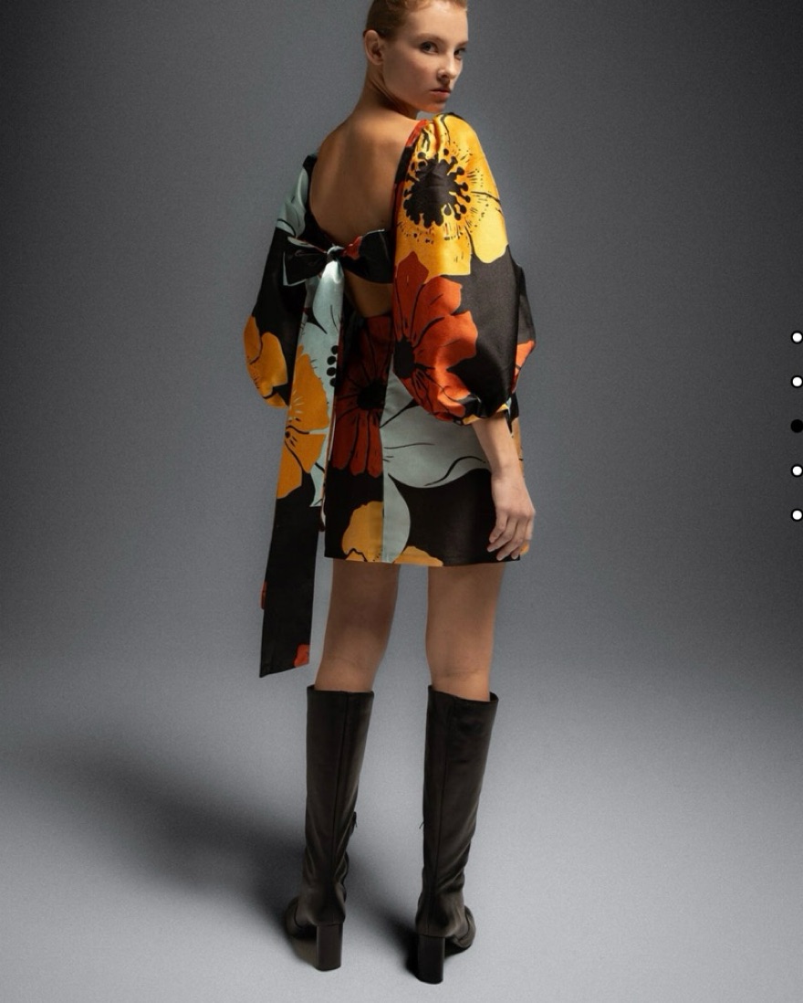 Printed puff sleeve short dress with a big tie on the back. Open back. Slits on sleeves. Invisible back zip fastening.