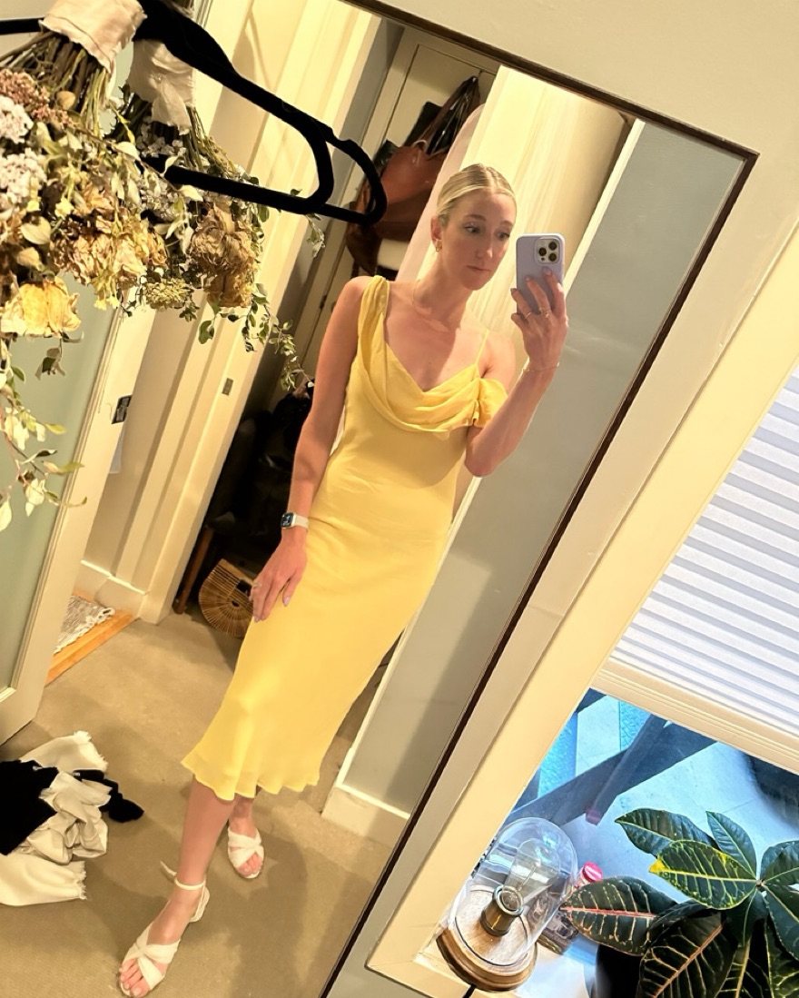 Size 4. Worn once for a wedding. Super flattering draped neckline and off the shoulder on one side