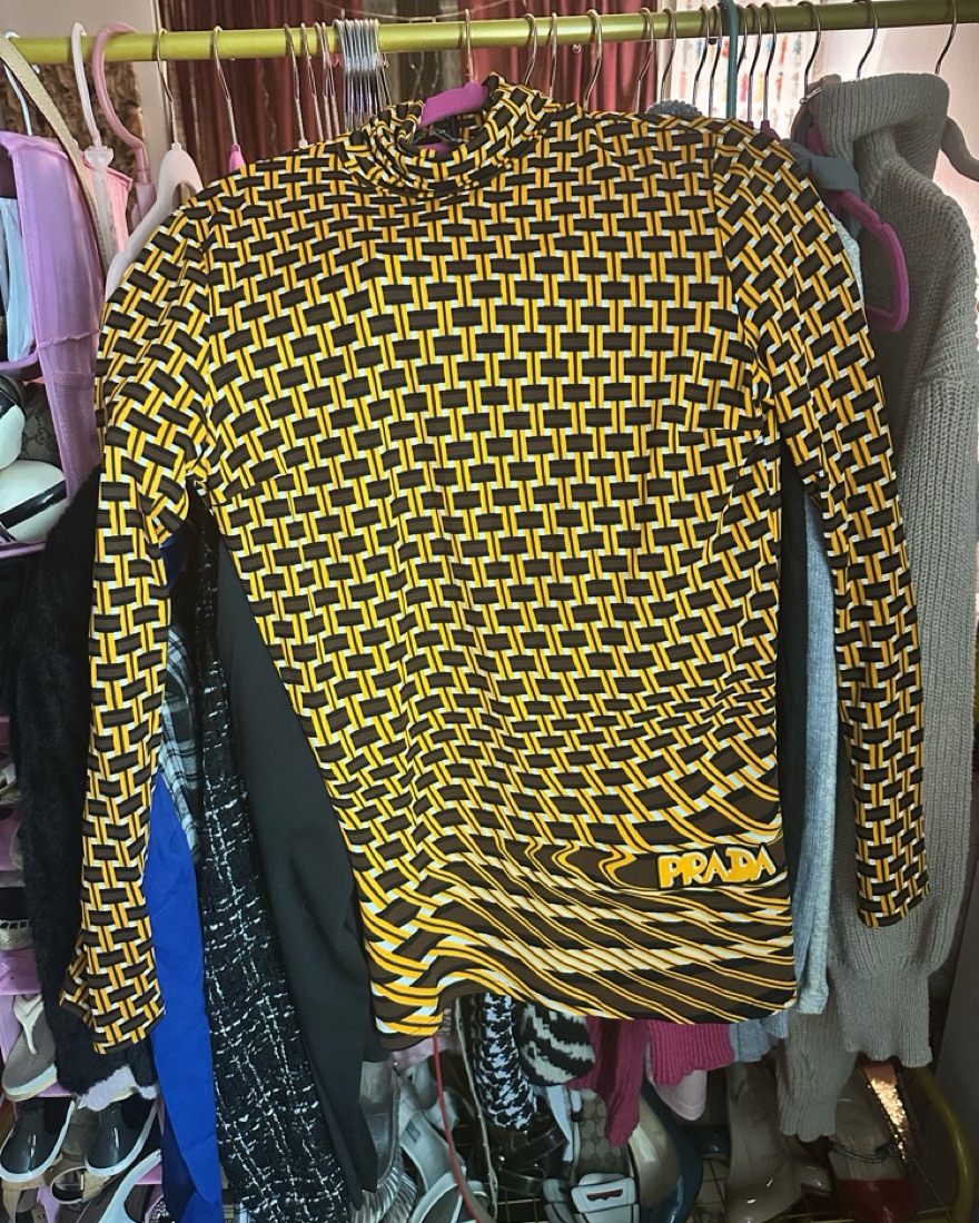Prada tunic with high neckline and zipper back. the coloring is very 70s, brown and mustard yellow, with a fun swirl pattern and branding on lower left. it’s an international size 40 but has a pretty slim fit. i am a US size 4 and it fits as shown in pic.