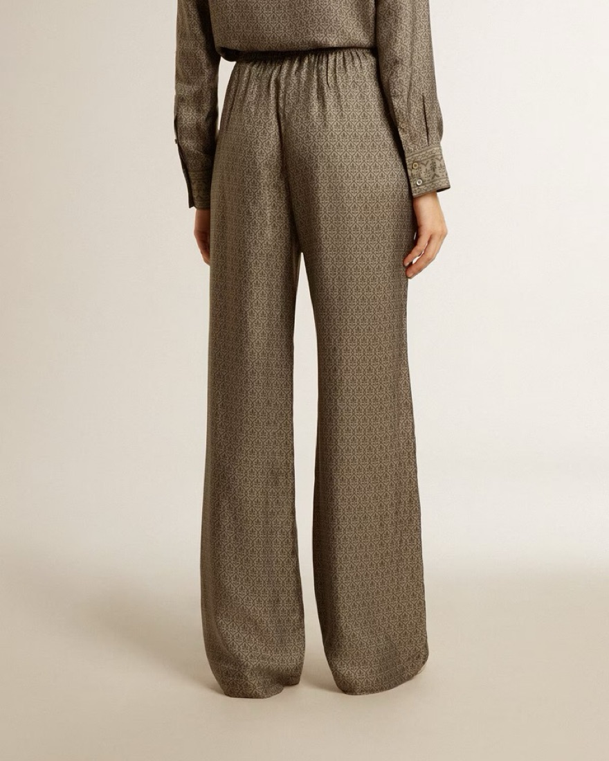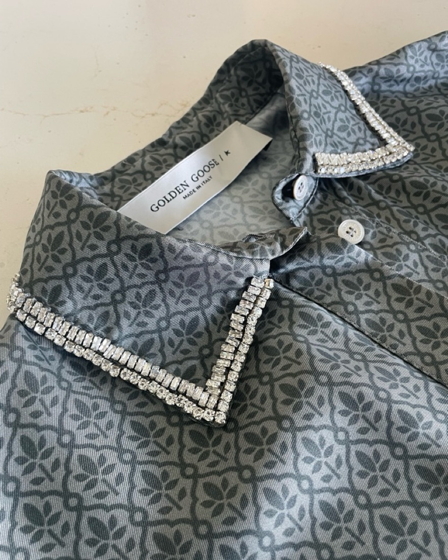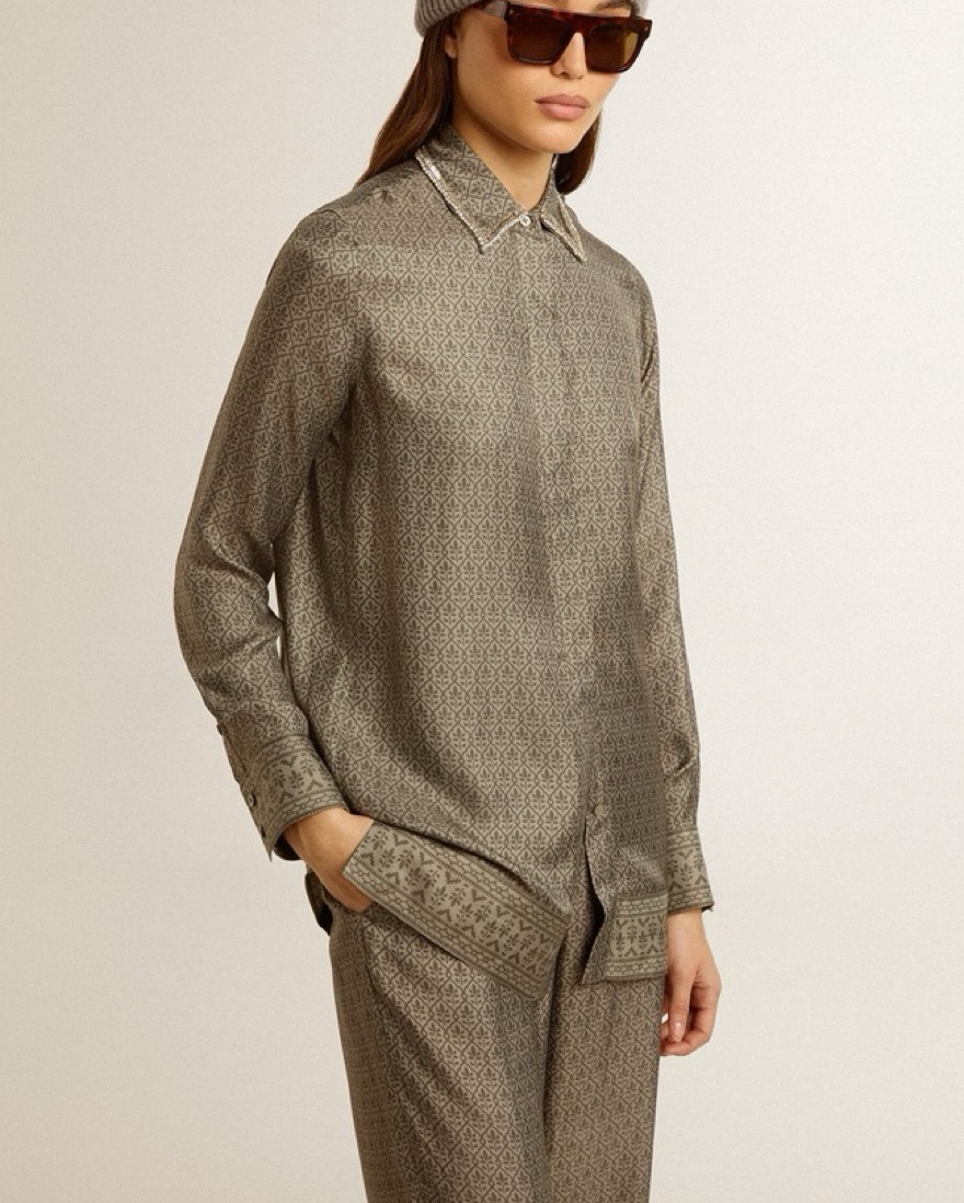 Golden Goose green viscose-blend silk shirt and pants set with floral pattern. Has crystal embellished collar. Pants have pockets. Very elegant fit with a relaxed look. New condition