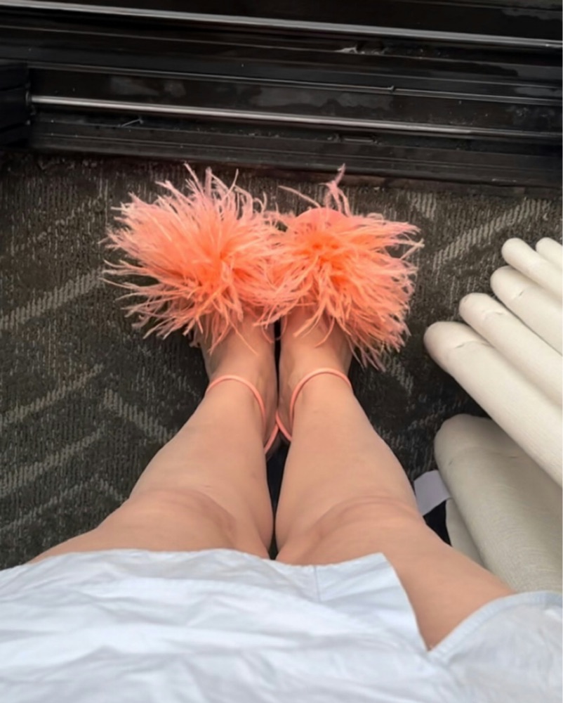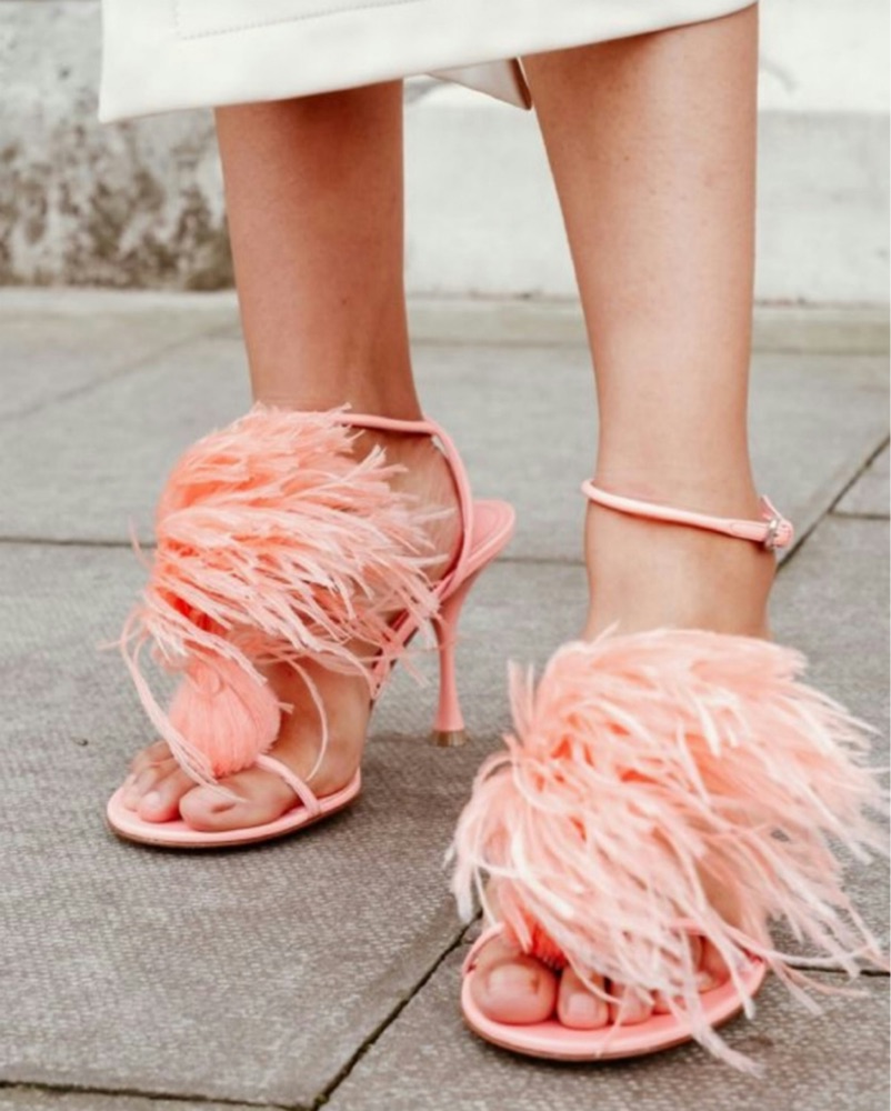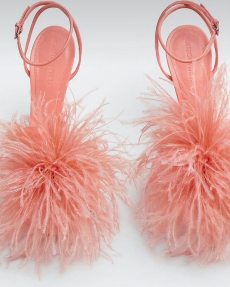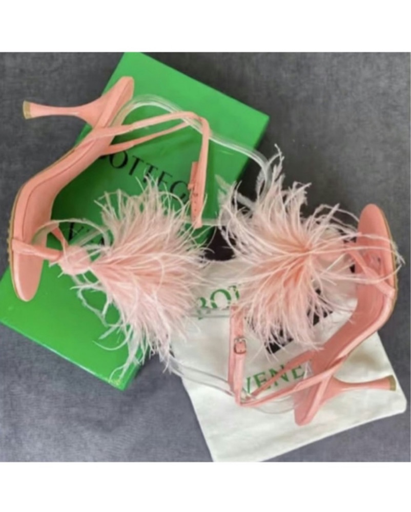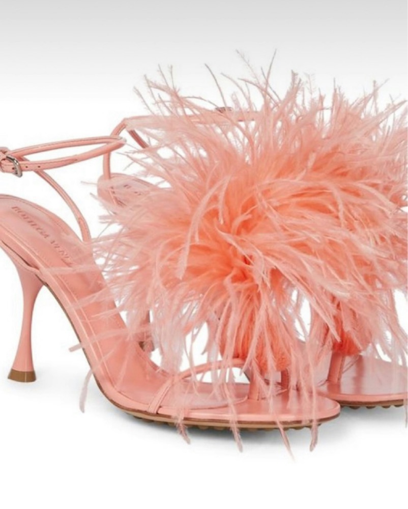 Playful high-heel sandals featuring soft ostrich feather detailing in a vibrant coral pink tone. Fun, flirty statement pair that instantly elevates party, cocktail, and special occasion outfits.