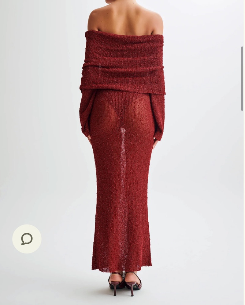 Meshki Marisol off-the-shoulder maxi dress is a show-stopping choice for a formal event or special occasion. The vibrant red hue and figure-flattering silhouette create an elegant and sophisticated look. Color is Plum.