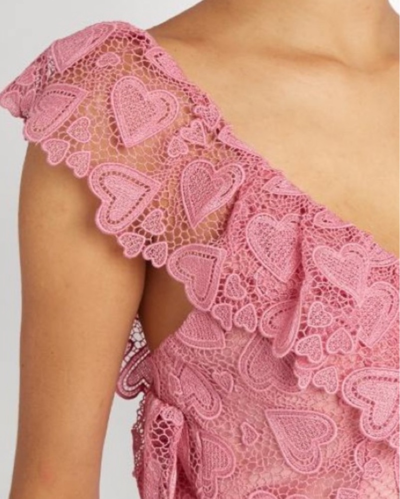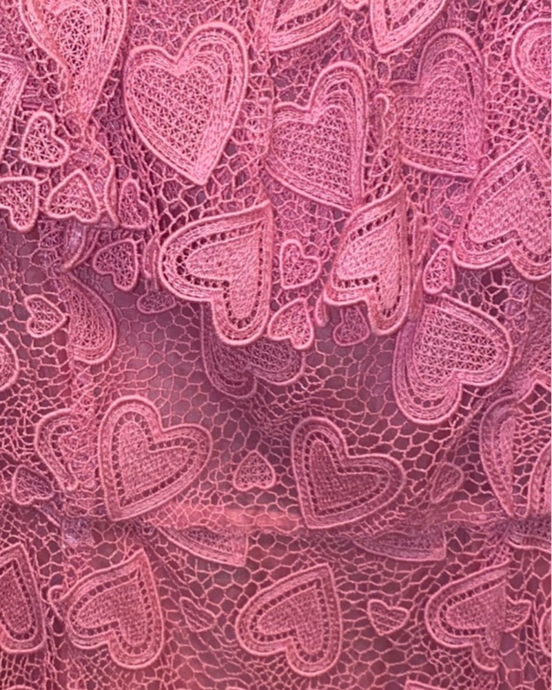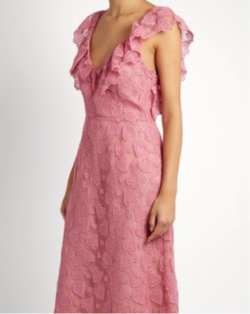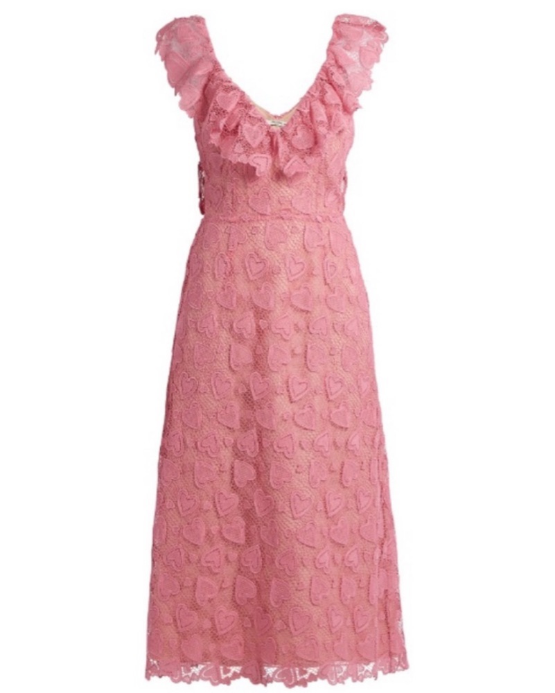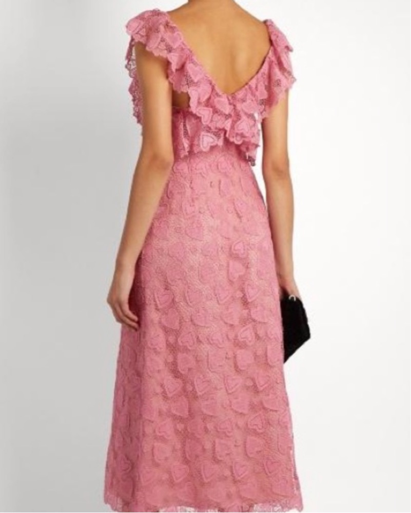 SHEER LINING. 44 IT. 2016 Collection rose-pink cotton-blend midi dress is an unabashedly sweet translation of Miu Miu's signature whimsical aesthetic. It has a feminine fit-and-flare silhouette that's intricately patterned with a heart-macramé lace overlay.