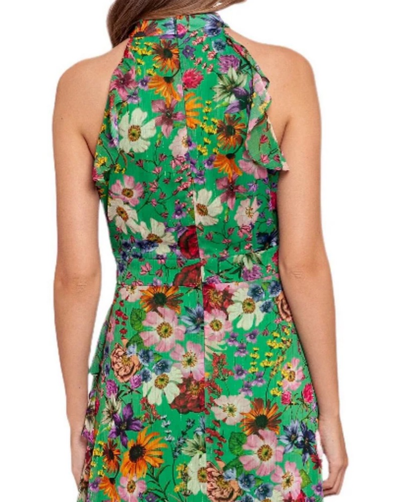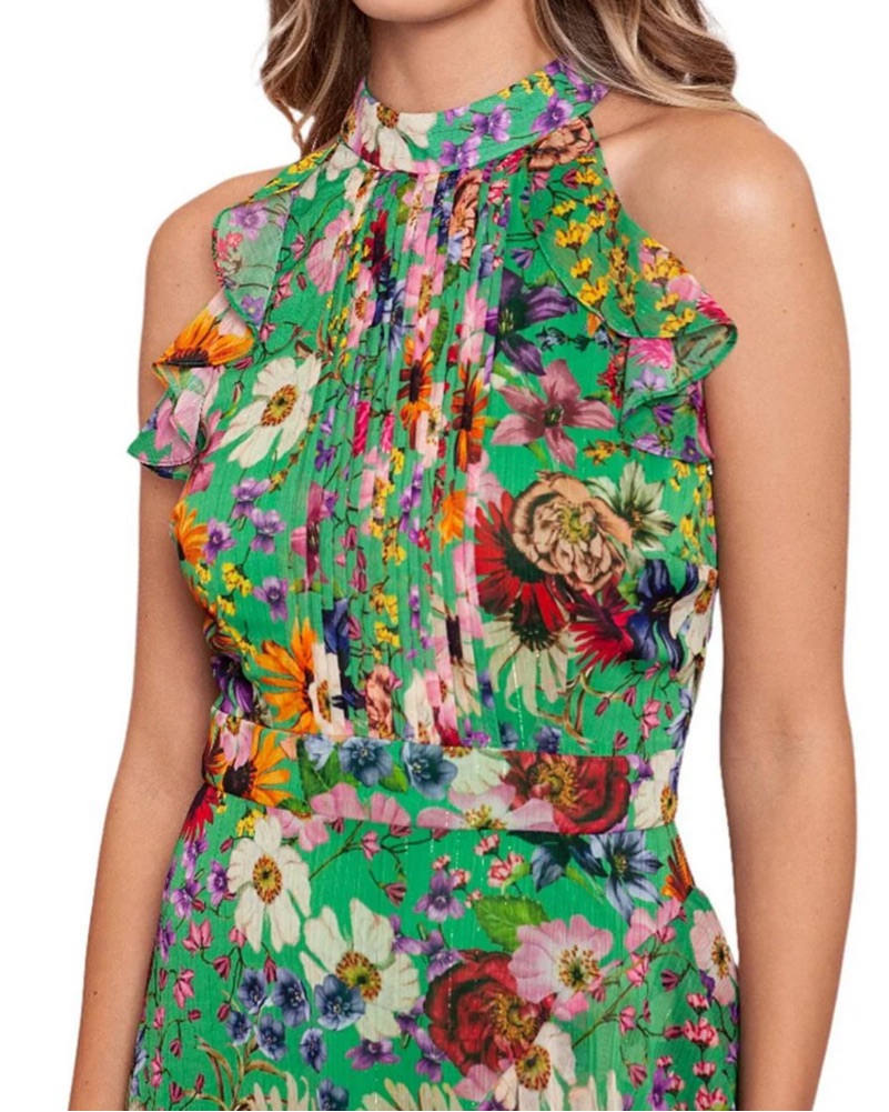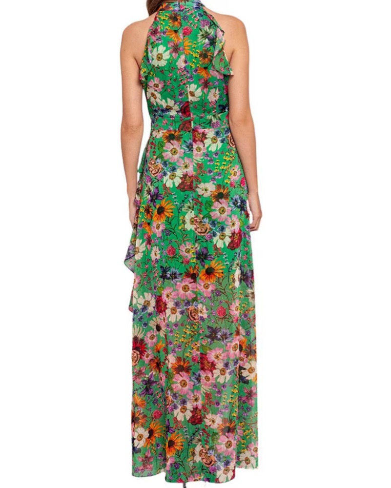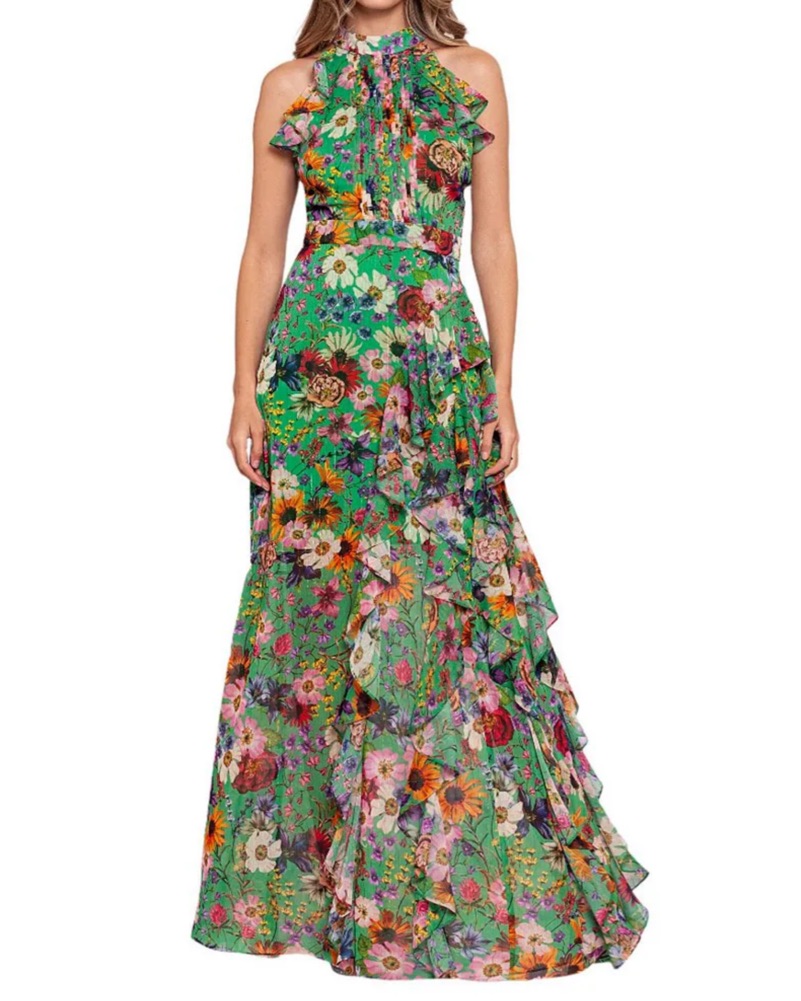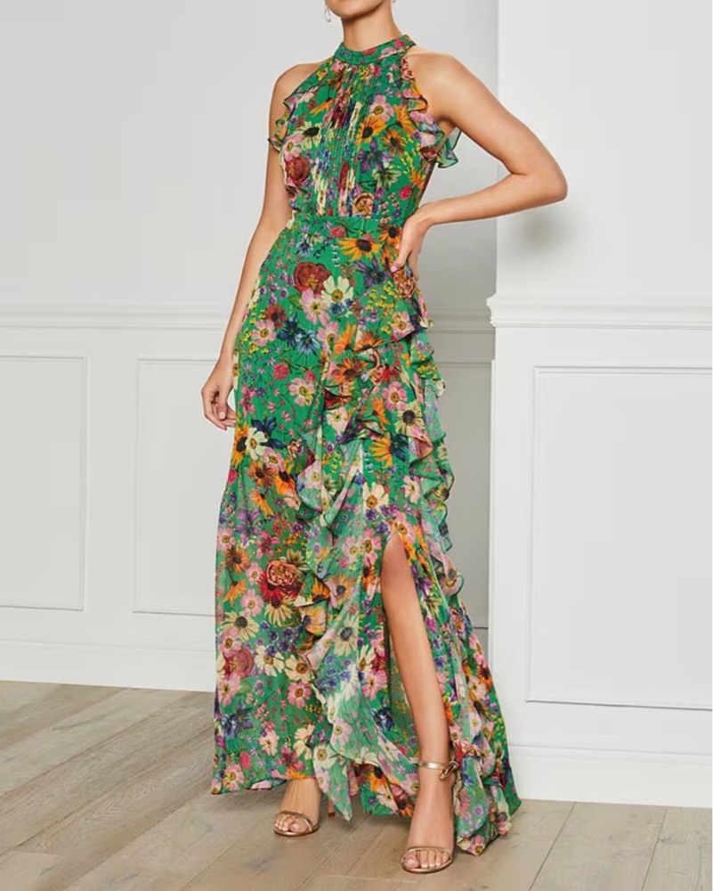 Maxi length floral maxi chiffon dress with ruffles and halter neck.