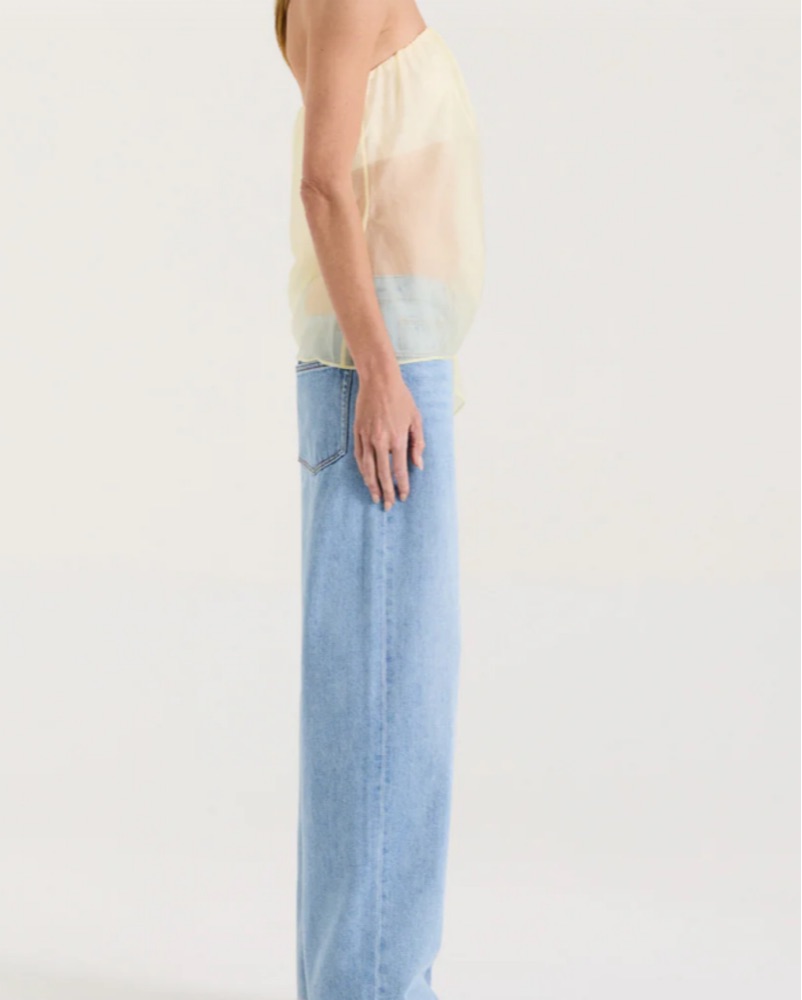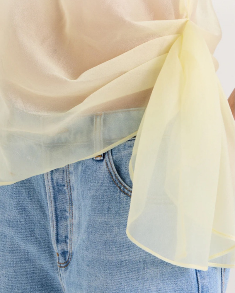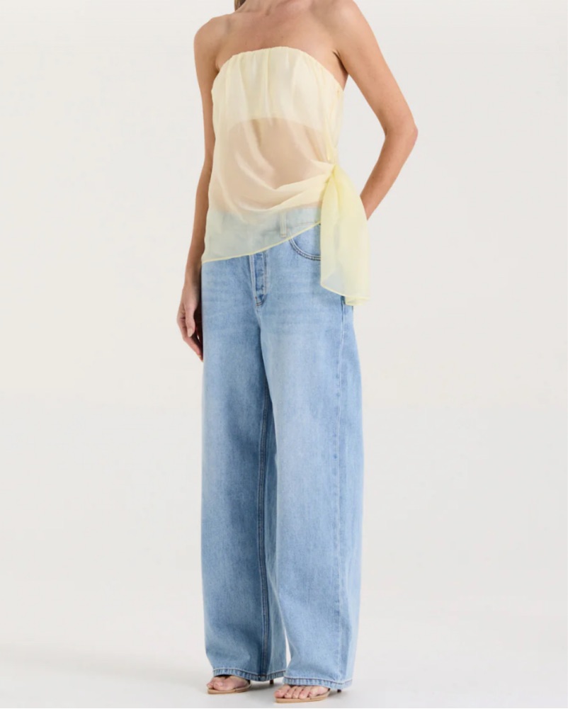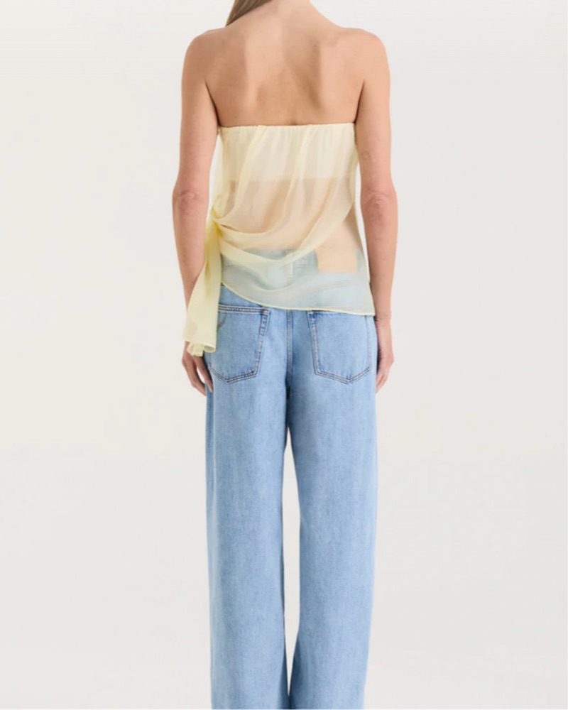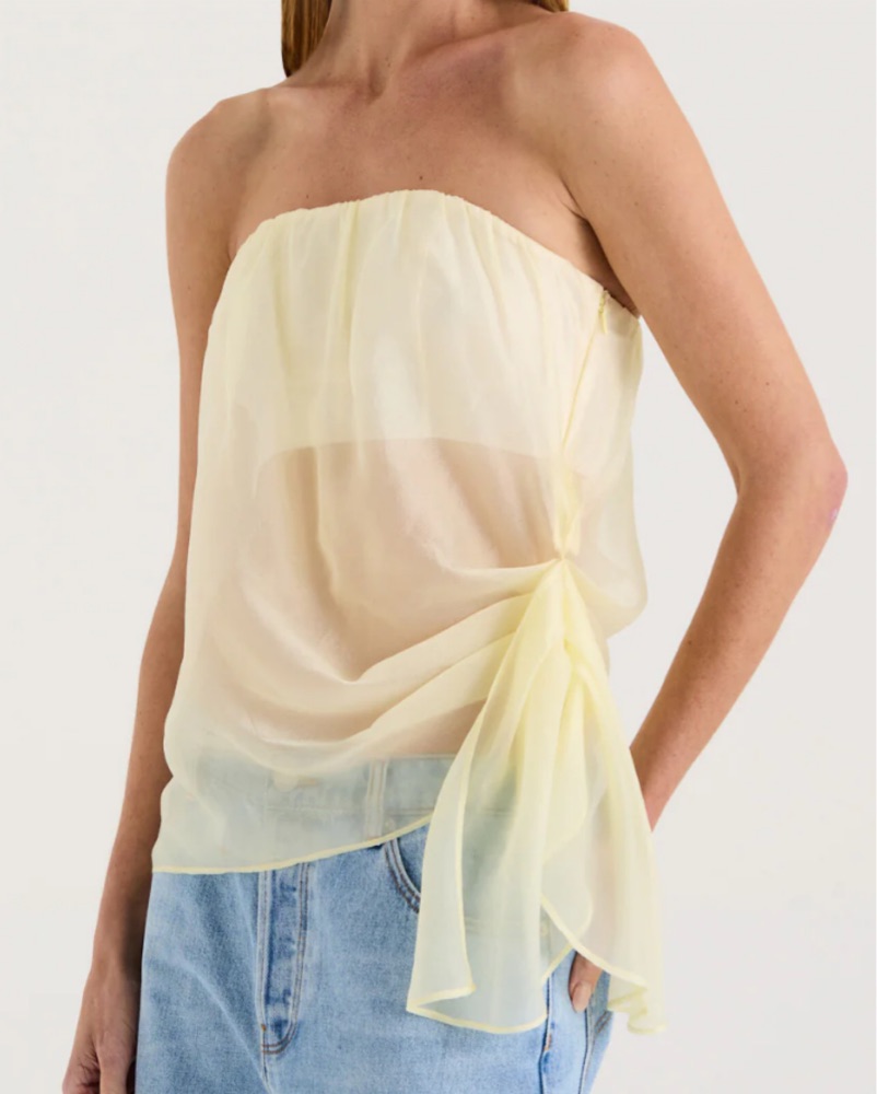 We introduce our best selling Norella Bustier Top in a fresh Lemon colourway. Norella is crafted in a unique sheer fabrication and designed with a strapless neckline and an asymmetric drape hem detailing. Effortlessly pair back with your favourite denim for an effortlessly elevated look.