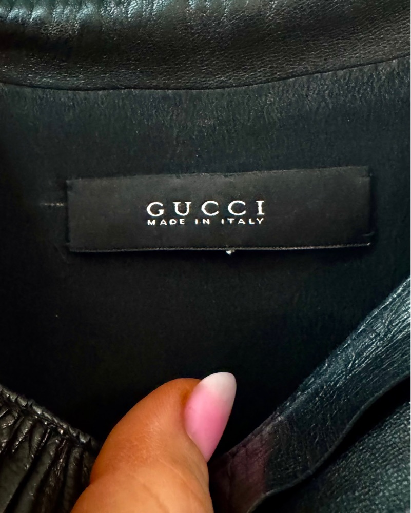 A rare Gucci runway piece crafted from buttery-soft genuine lamb leather. This sculpted black dress is luxury, with a sleek silhouette that flatters the figure while maintaining timeless sophistication. The intricate panel detailing adds depth and texture. Mint condition.