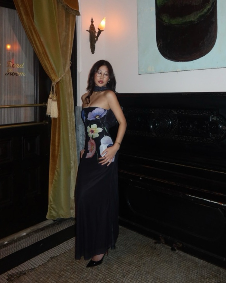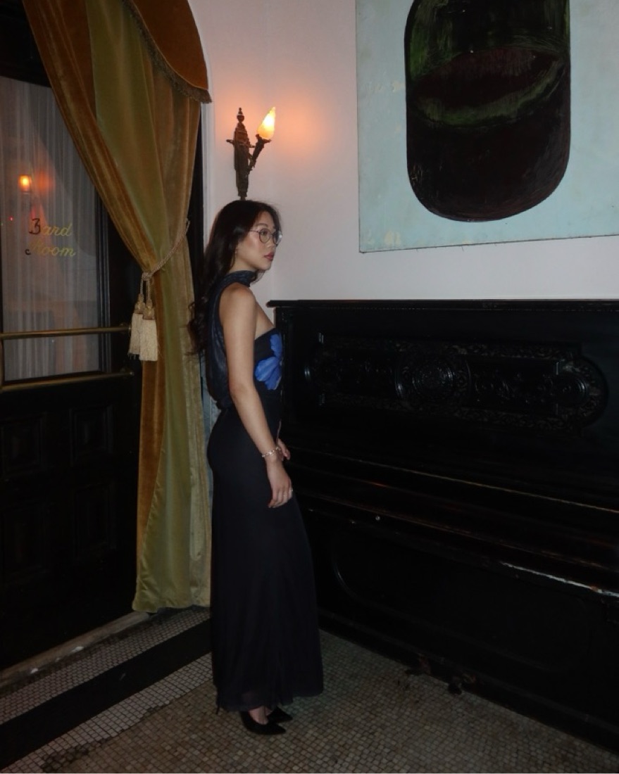 Maxi mesh dress, lined, reverse halter design, zipper on side, adjustable strap in the back