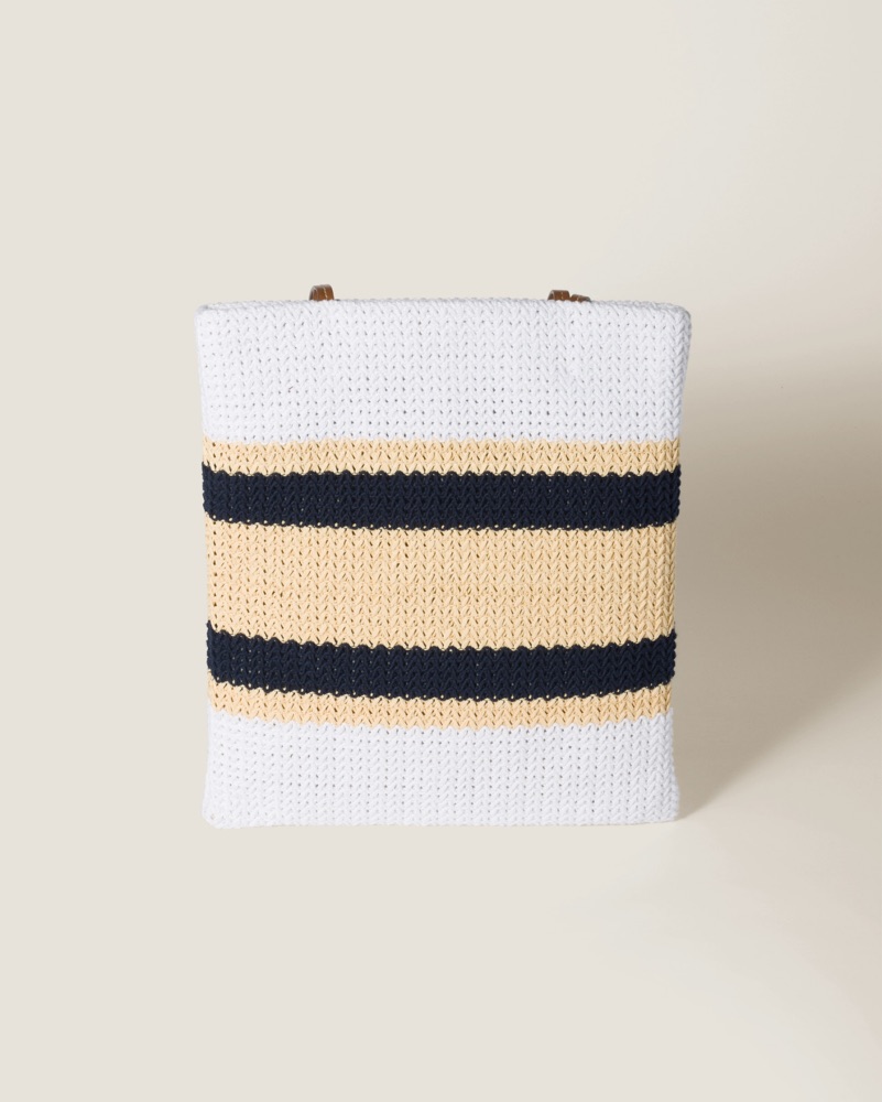 Miu Miu reimagines the classic tote bag in a crochet version. A lively colorful pattern covers the bag, giving it an edgy touch. The embroidered logo gives the accessory an iconic and immediately recognizable style.