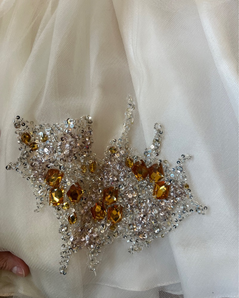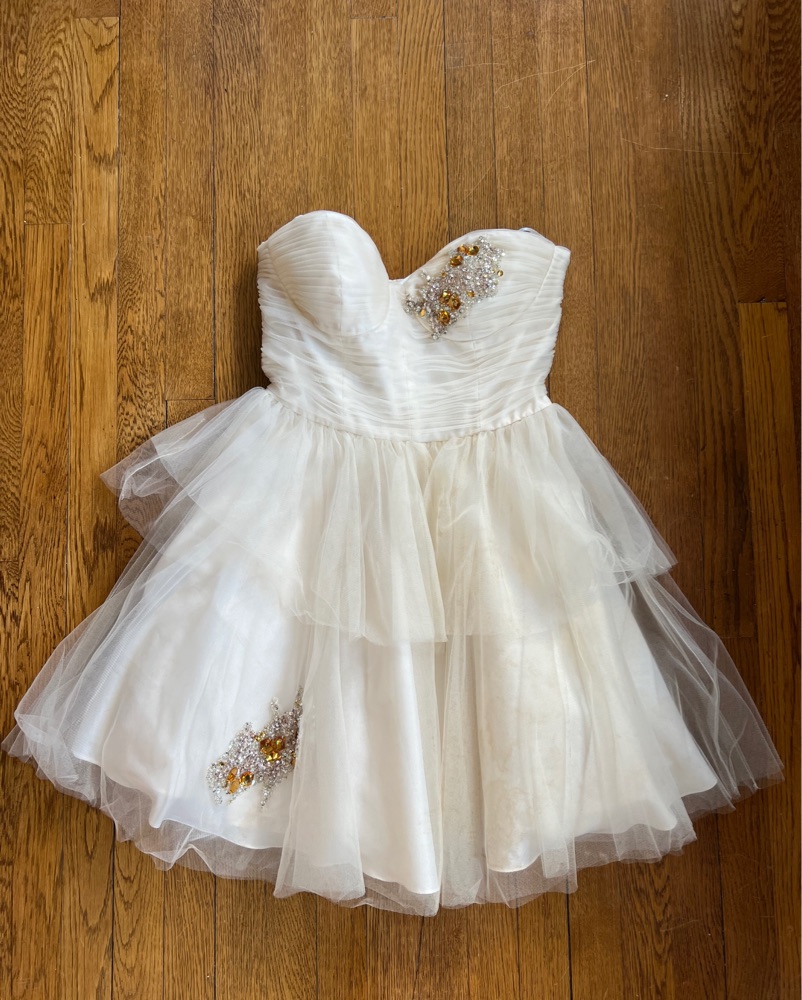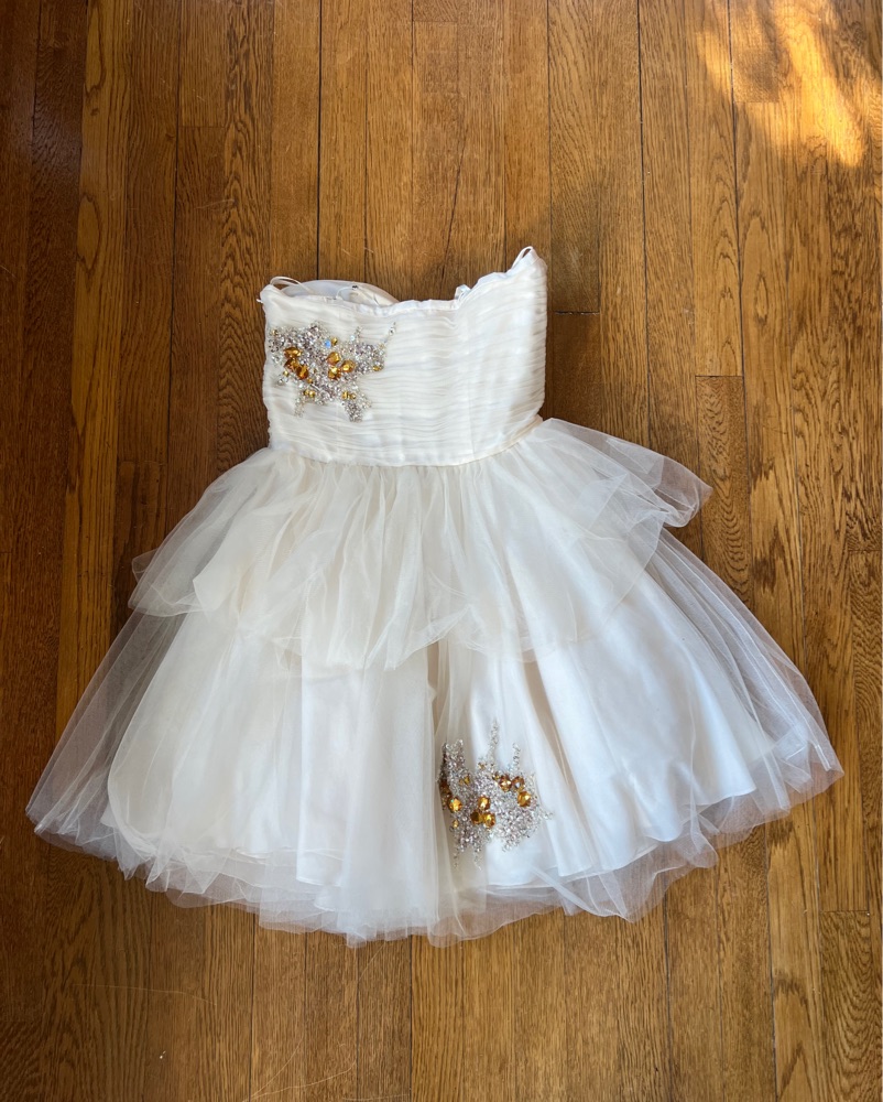 Basix Black Label strapless ivory tulle cocktail dress with layered skirt and jeweled appliqués. Perfect for bridal showers, graduations, or any dress-up moment. Worn once, excellent condition.
