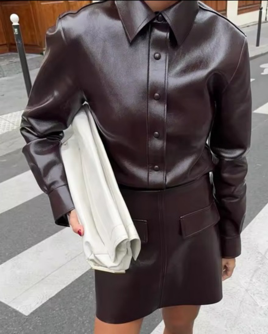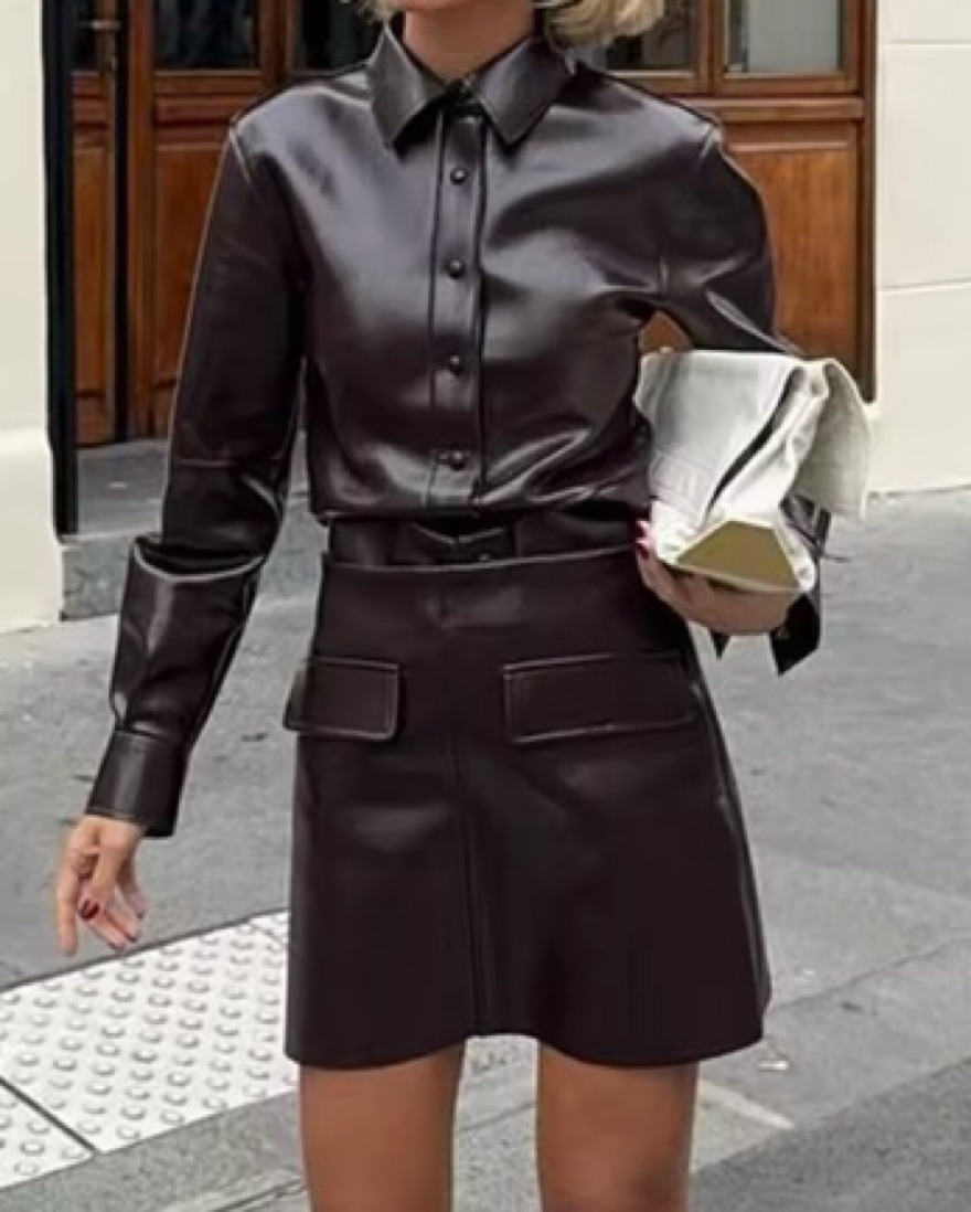 Two piece burgundy leather set with button down top and mini skirt. skirt fits more like a XS than a small (still fits as small, just a tad tighter as fyi!)