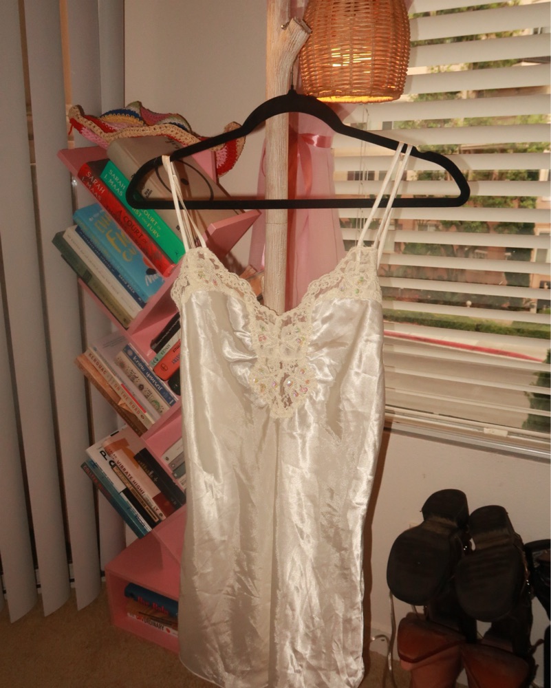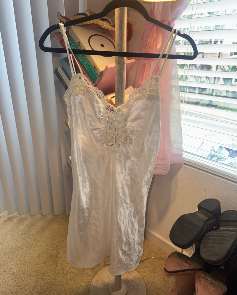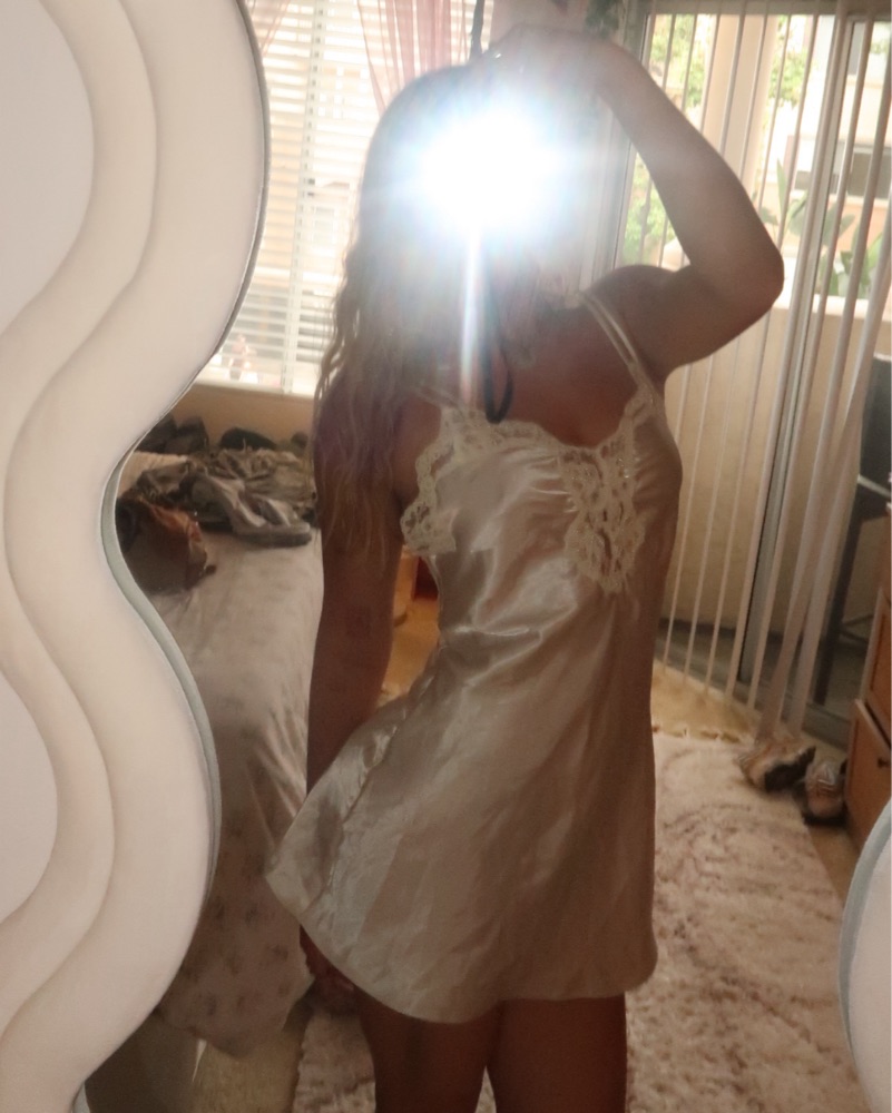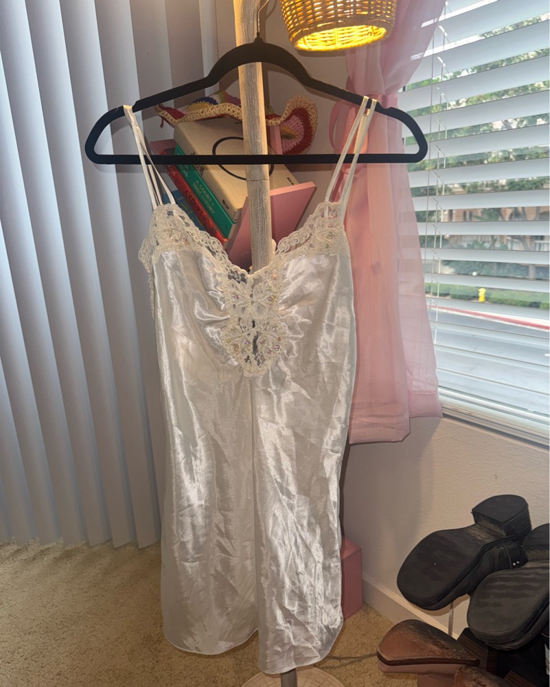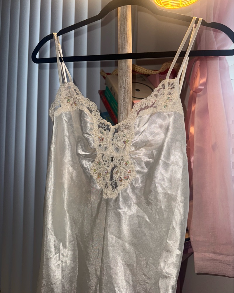 This stunning camisole dress features intricate lace detailing and a luxurious satin fabric, perfect for a romantic evening out or special occasion. It is mesh and see through in the back near butt so may want to wear shorts under depending on vibe. More of a cream than white