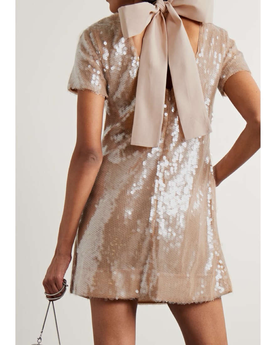 Status x Net-a-Porter mini dress. Nude/pink color with iridescent sequins, ribbon bow neck tie, short sleeves. Size medium, shortened slightly, fits xs-m depending on the fit you’re going for! The most fun party dress