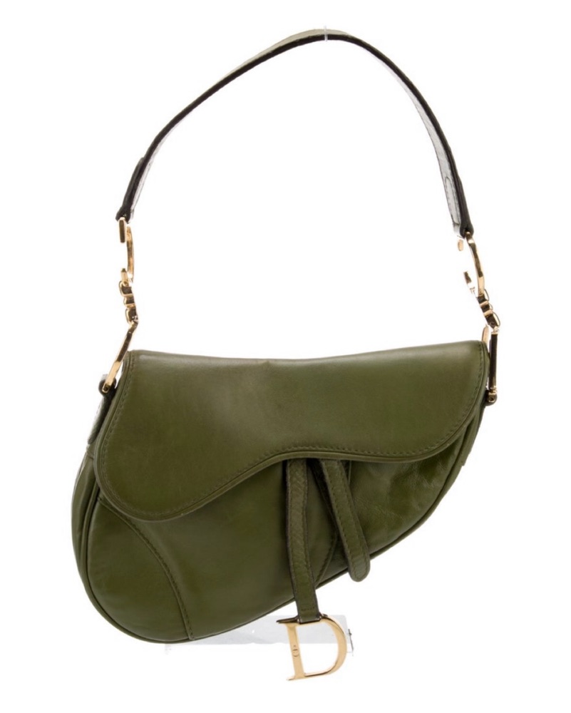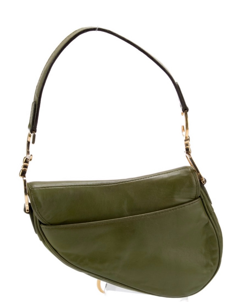Green leather, gold hardware. Authentic Vintage mini Dior Saddle shoulder bag! Has interior zipper pocket