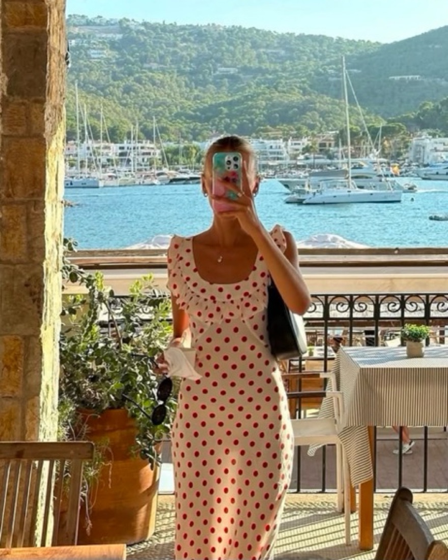 maxi off shoulder dress, white and red polka dot, iconic realisation par dress. please return dry cleaned.