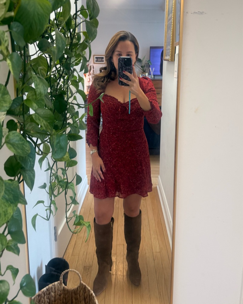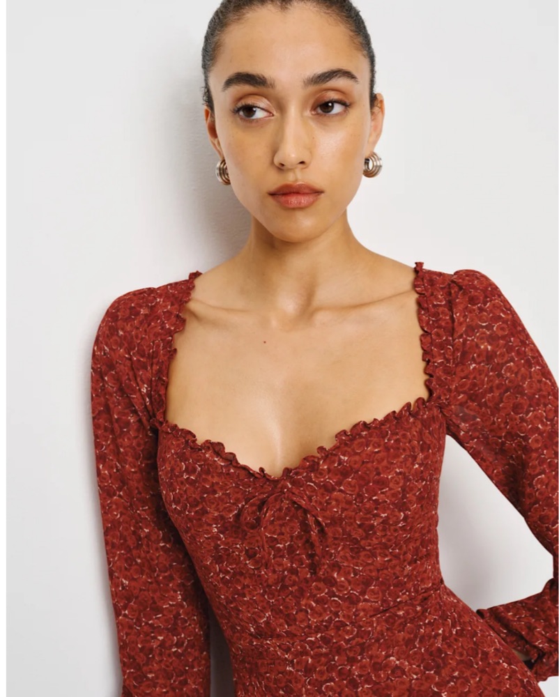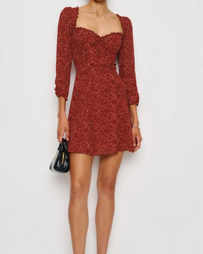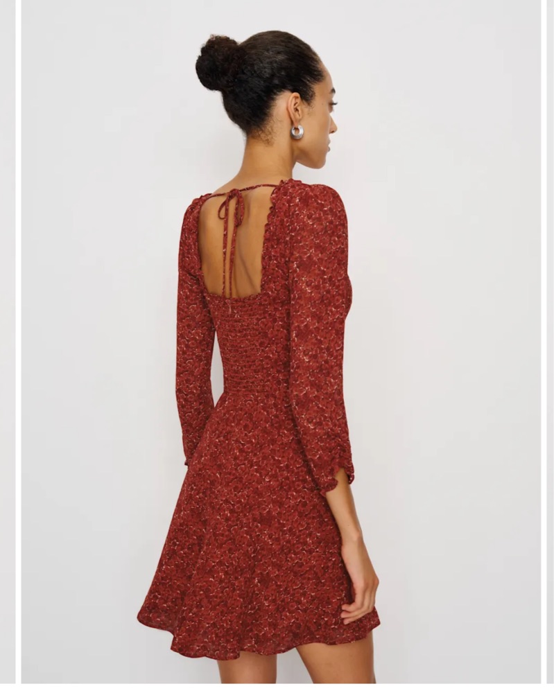 Remi Dress from Reformation, a long-sleeved mini dress with a sweetheart neckline. Designed to be fitted at bodice with an A-line skirt.Back smocking, sweetheart neckline, back zipper, ties in front, ties at neck. I’m a pretty true size 4 and a 32DDD.