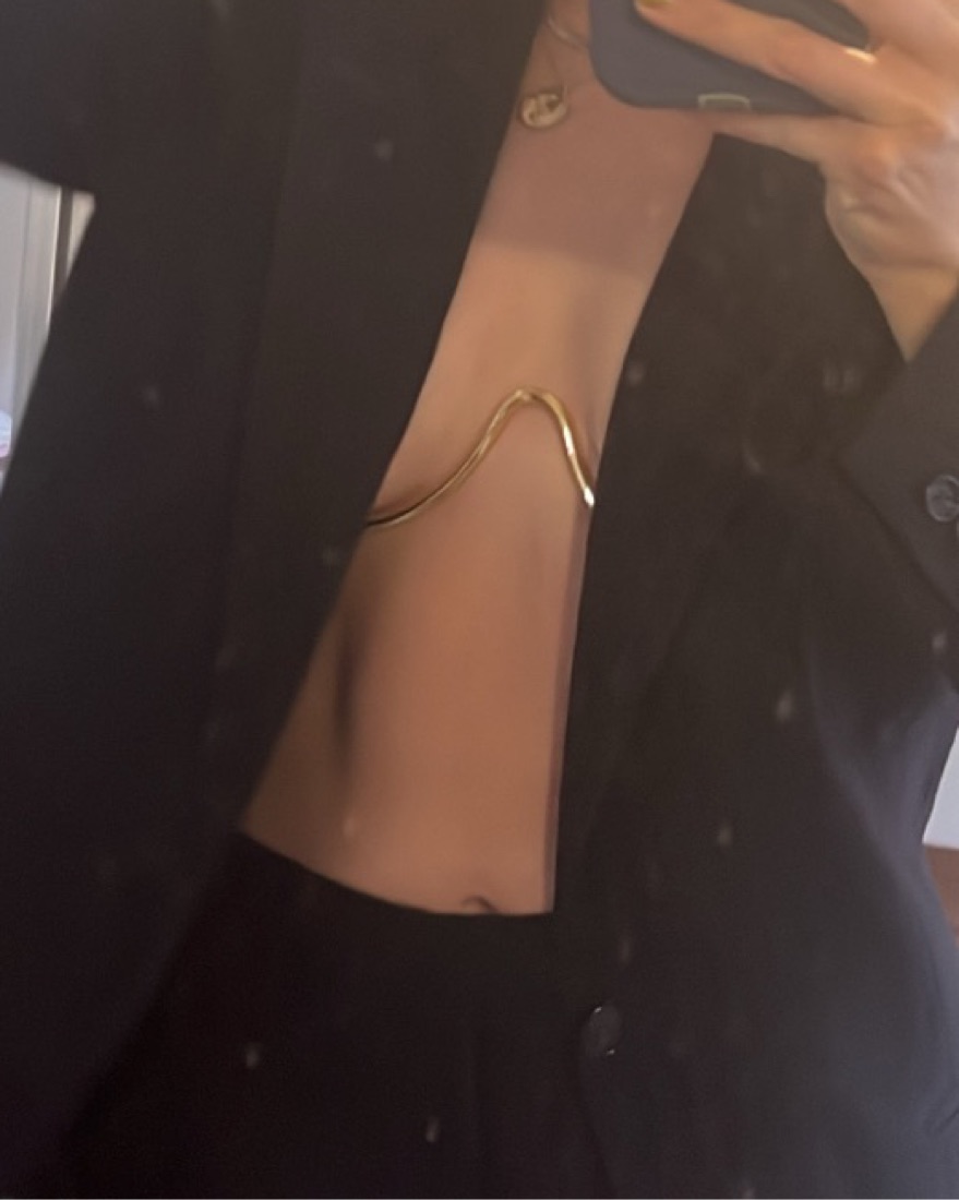 The Asha is a stunning, sculptural bralette. This halter piece features a golden bust with two chains that clasp with lobster claws behind the neck and at the back. Made for a smaller bust, fits sizes A and B best.