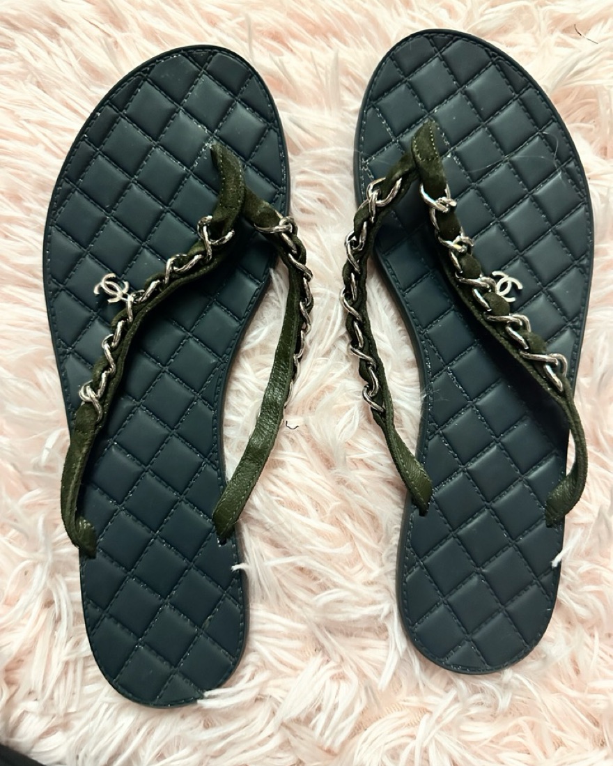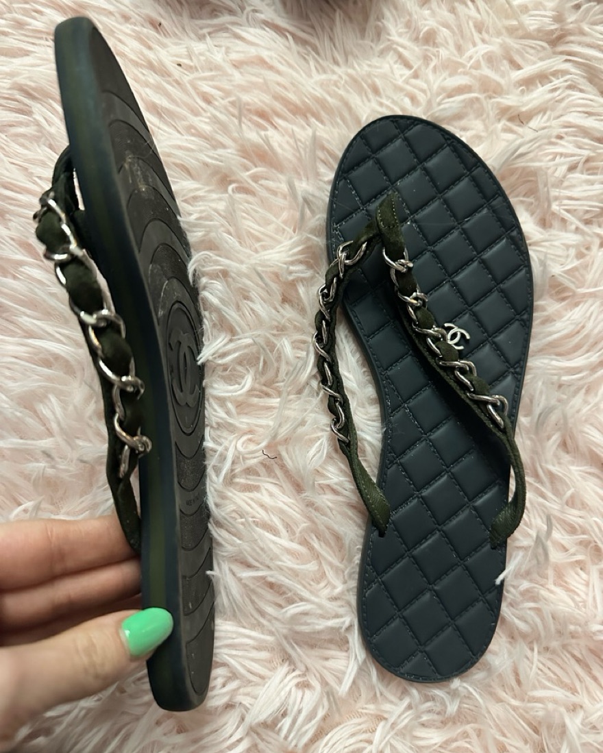 thin black Chanel flip flops with quilted sole design, chain embellishment on straps, and dangling CC logo charm. size 35.