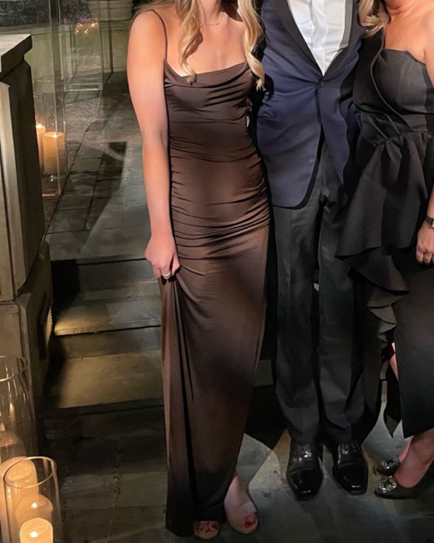 Long brown dress, worn for black tie wedding!