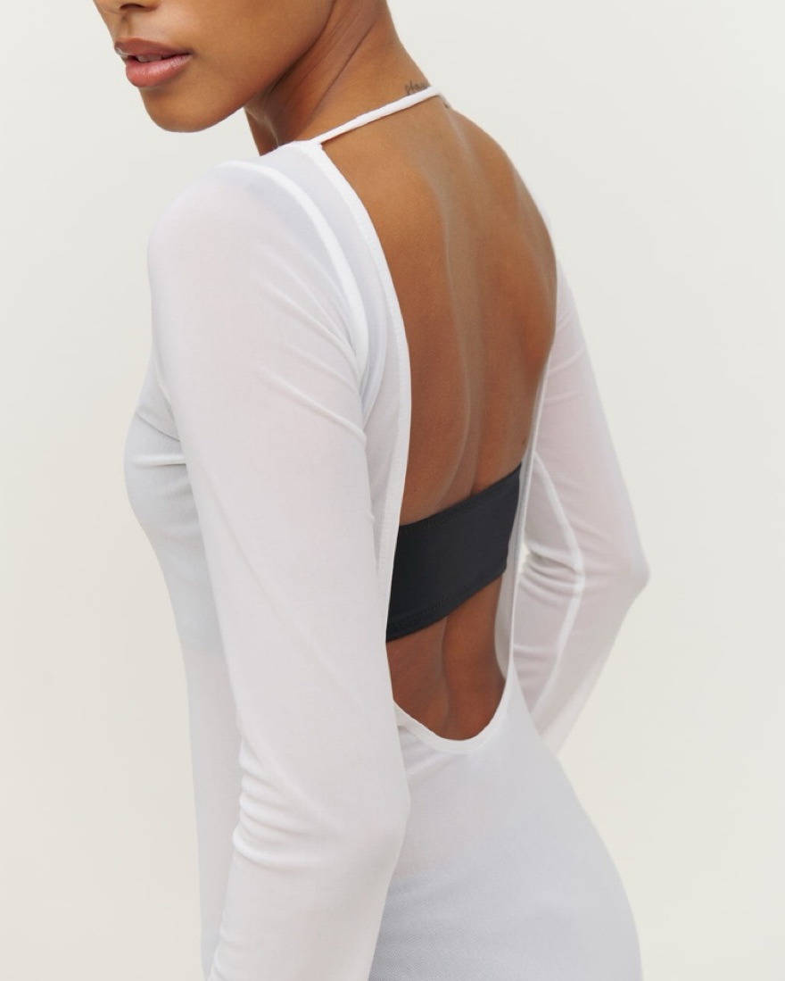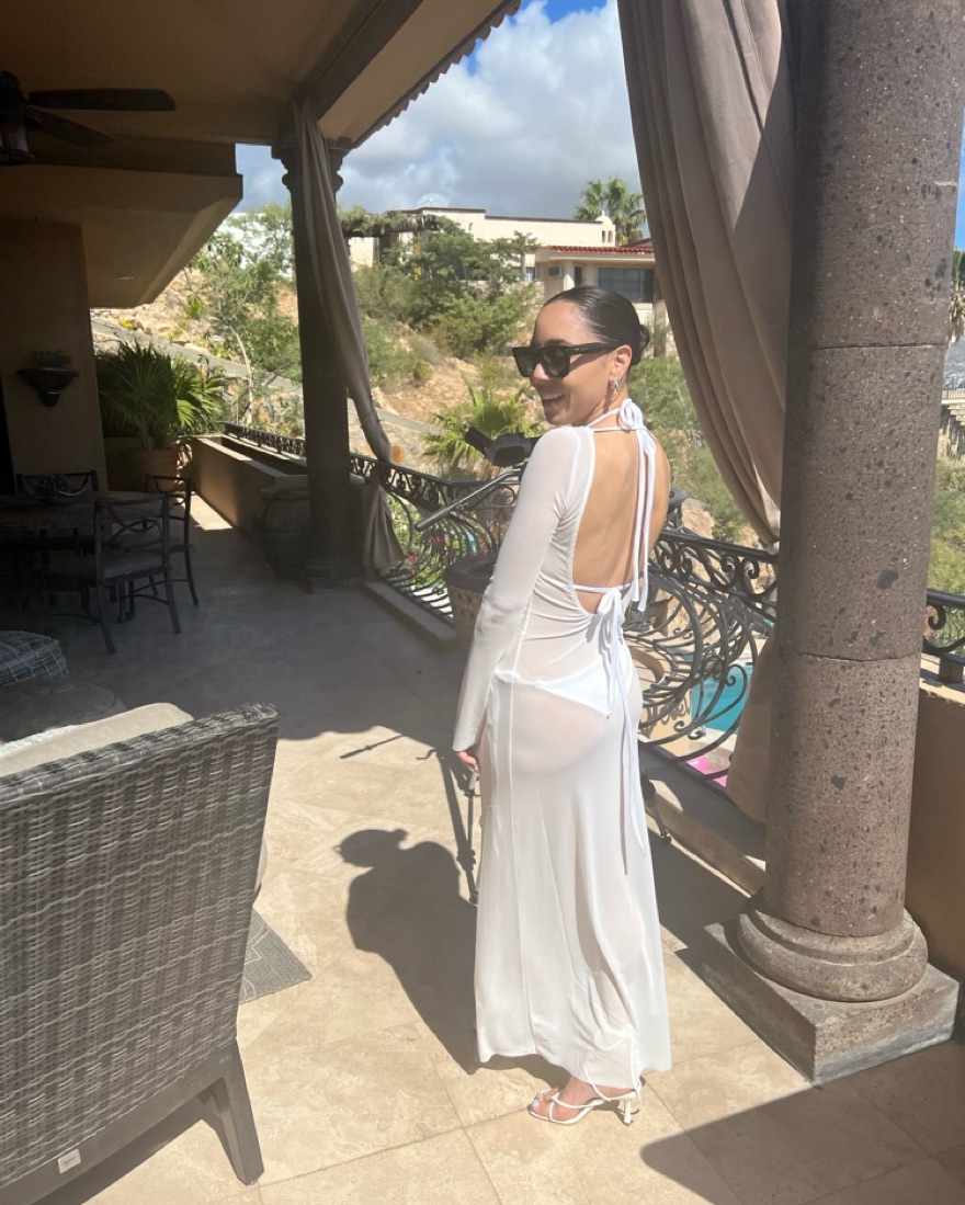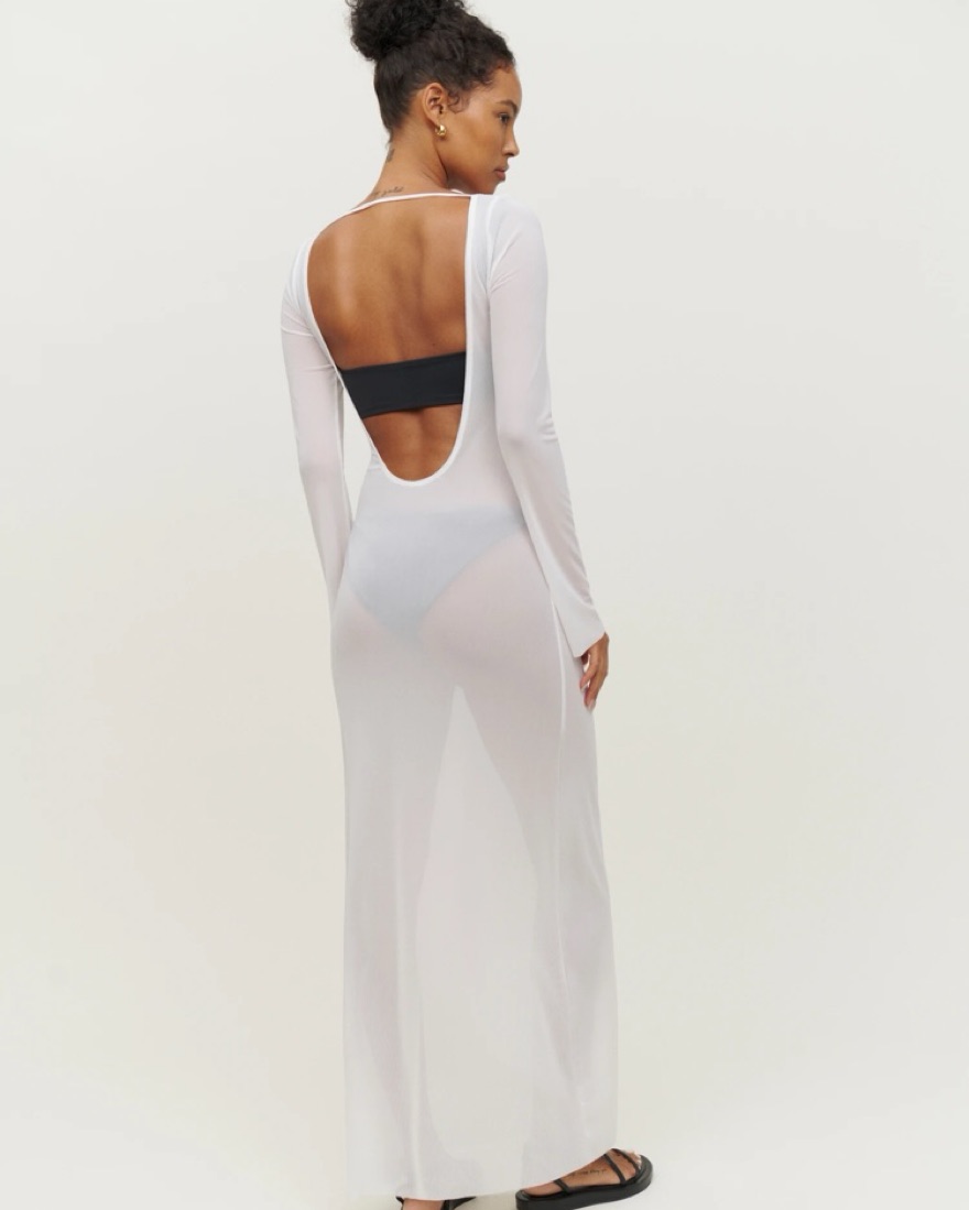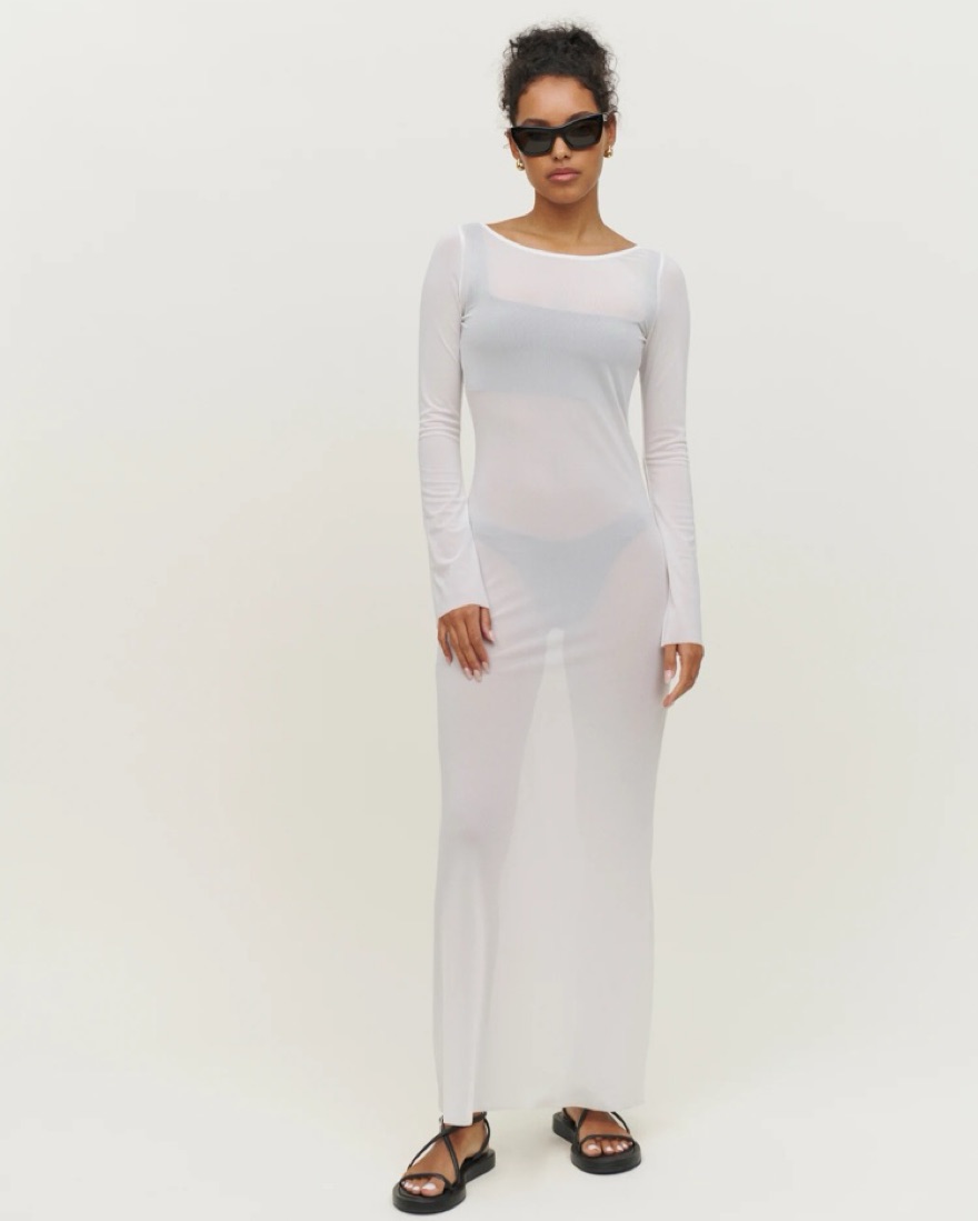 Larri Knit Dress from Reformation, a sheer maxi dress with a high neckline, long sleeves, and an open back. Perfect for vacations over a bathing suit or bachelorette parties!