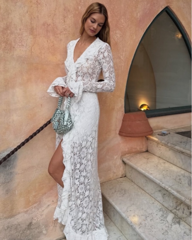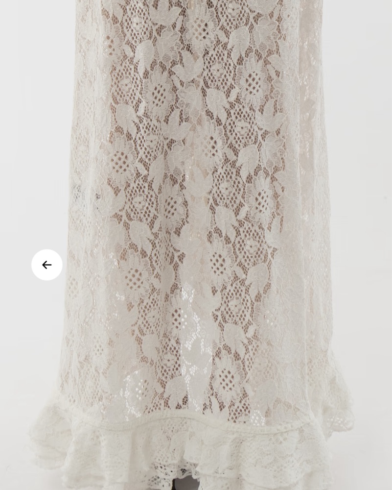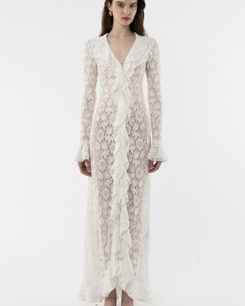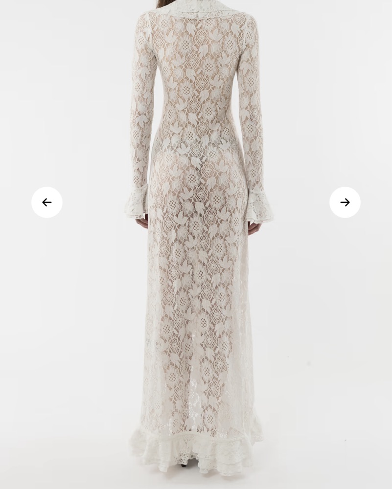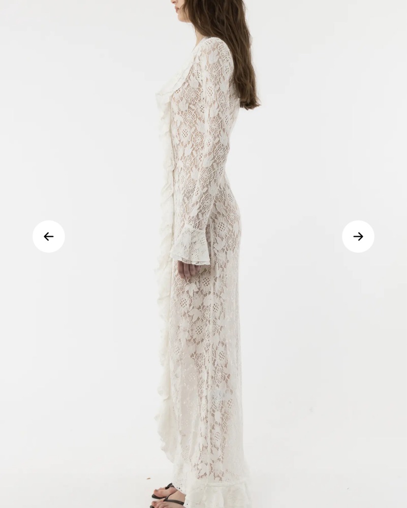 Lace with intricate floral pattern, featuring cascading ruffles along edges and sleeves. This long sleeve, maxi dress is adorned with front fabric-covered buttons. Wear it as a beach cover up, cardigan with jeans, or buttoned up as a dress. This piece is delicate, please return clean.