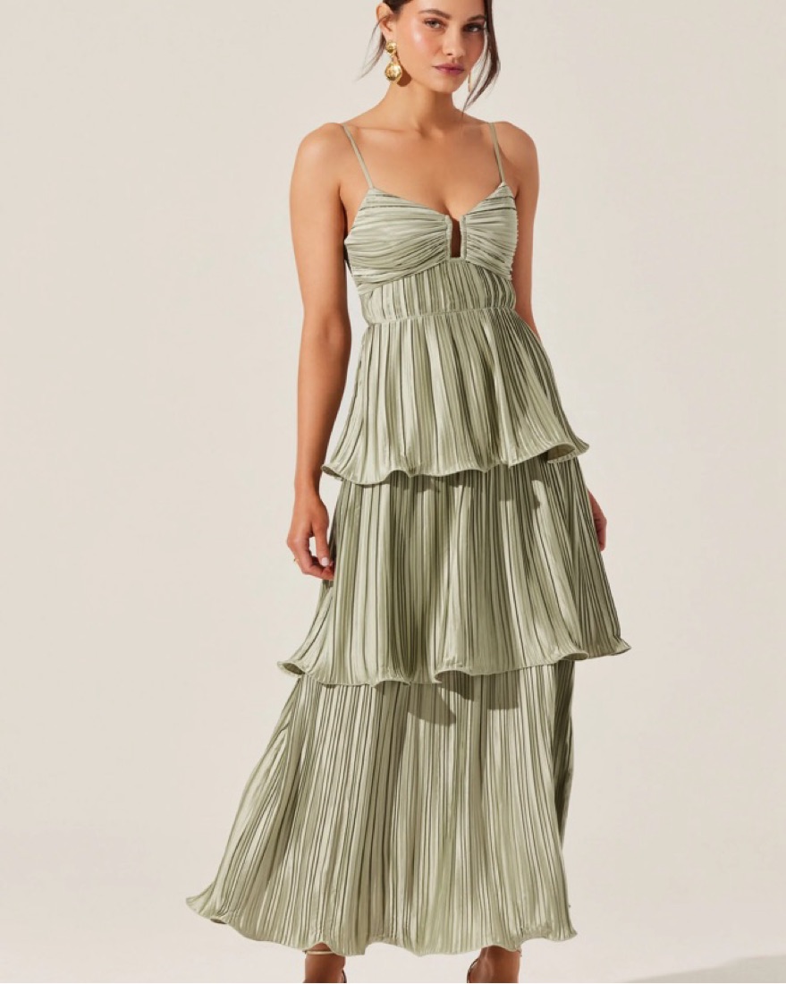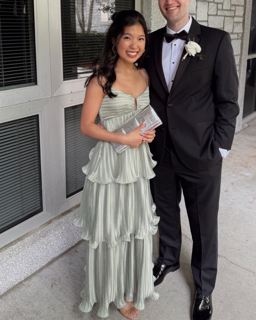 Sage green ruffled dress that’s perfect for weddings! Black tie, cocktail, etc. I didn’t tailor the length—it’s meant to be sort of an ankle length but I’m 5’3” so I wore it as a long dress! Ran slightly big so it’s been tailored into a true XS.