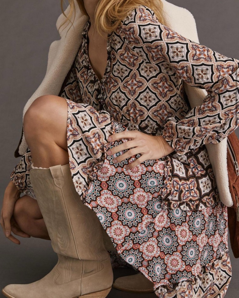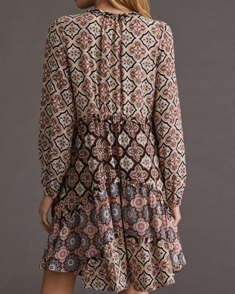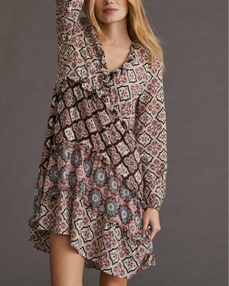 Anthropologie Tiered V-Neck Mini Dress features a ruffled v-neckline, long sleeves with elastic cuffs, and a tiered mini silhouette with asymmetrical hem. Partially lined. Pull over styling. Pairs perfectly with boots and an oversized cardigan or moto jacket for your go to cooler weather look.