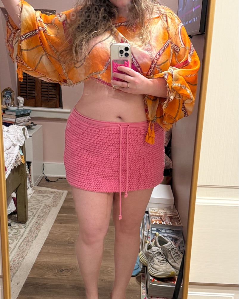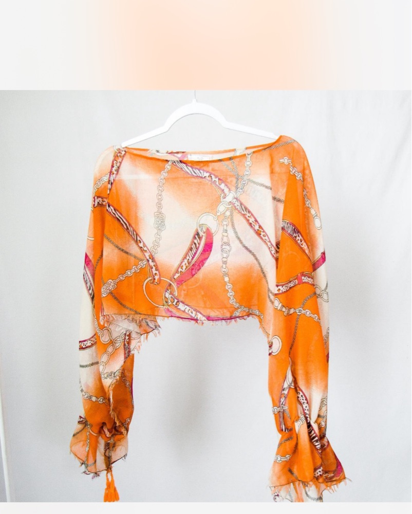 The cutest vintage cropped poncho top that’s slightly sheer, with elastic cuffed sleeves and a boatneck. One size will fit most!!