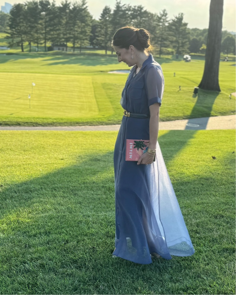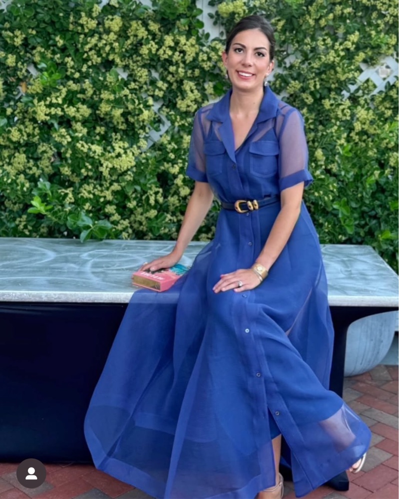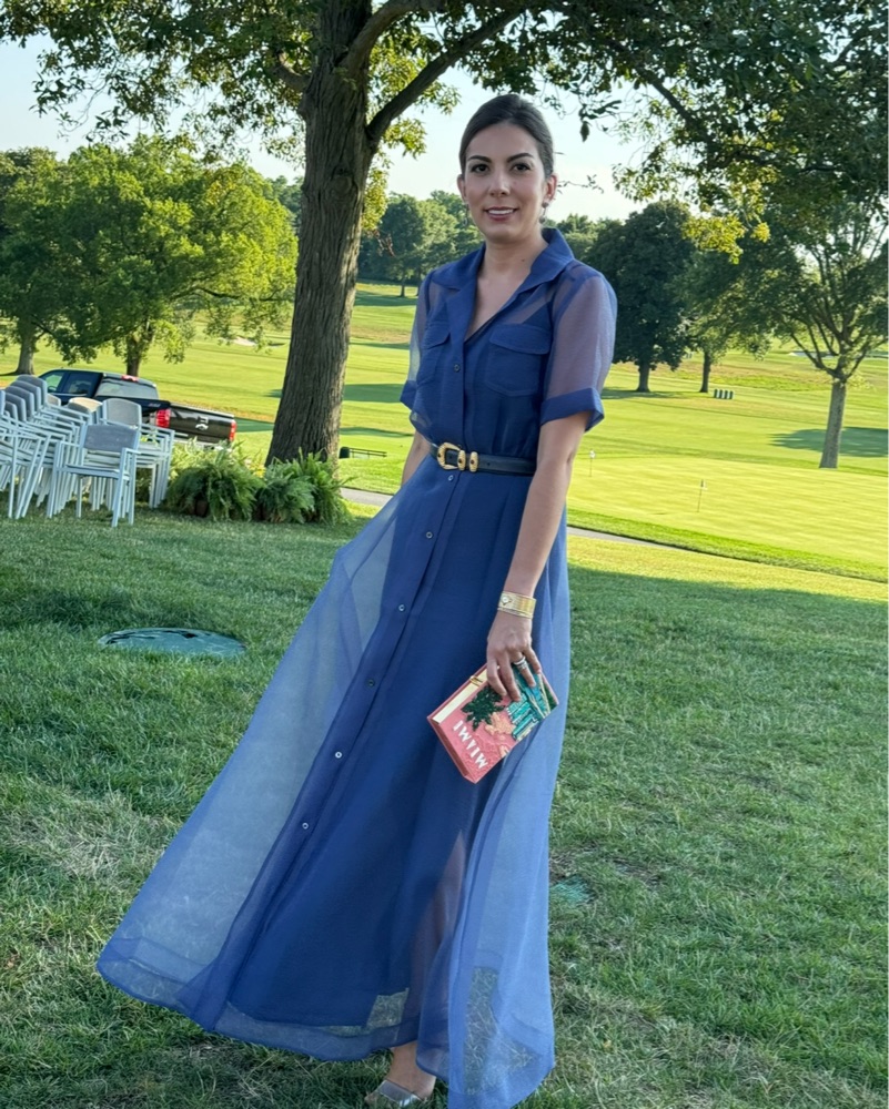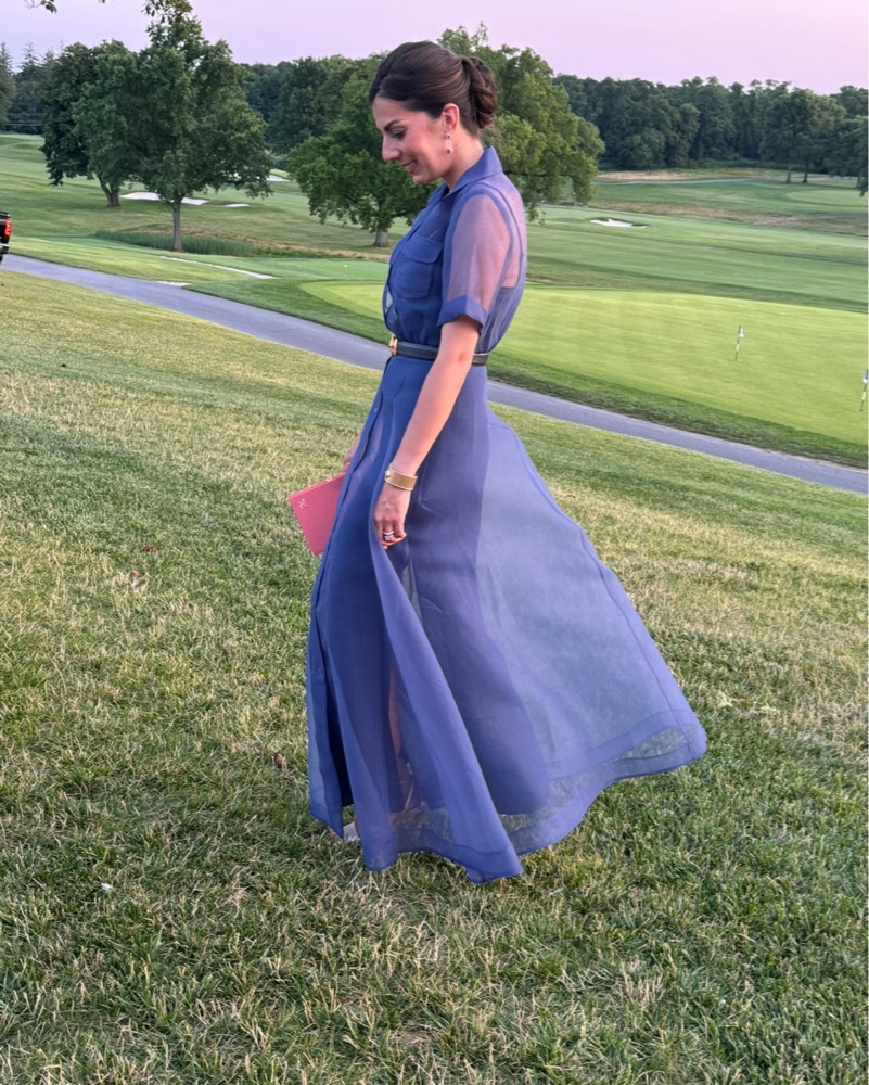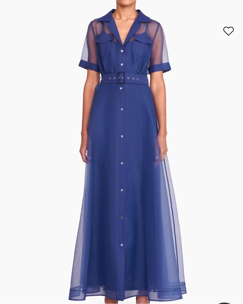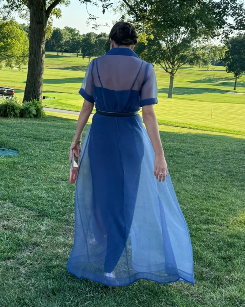 Bright navy maxi-length short dress in sheer organza with coordinating slip. Button front closure with cargo pockets at bust. Very light weight, and easily dressed up/down. Note: Belt pictured is not included in the rental. Please see last photo for the belt that comes with this dress.