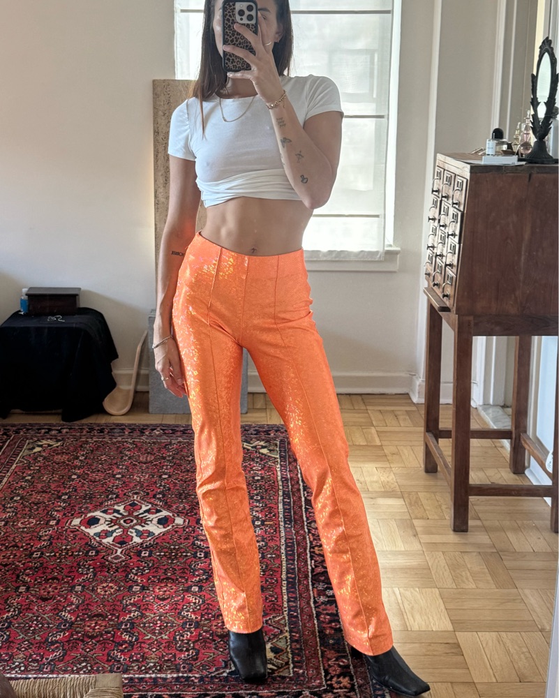 Fun and flirty orange shimmer lissi pants from Saks Pots. Fits XS/S. Got them taken in a bit at the waist so they fit very micely