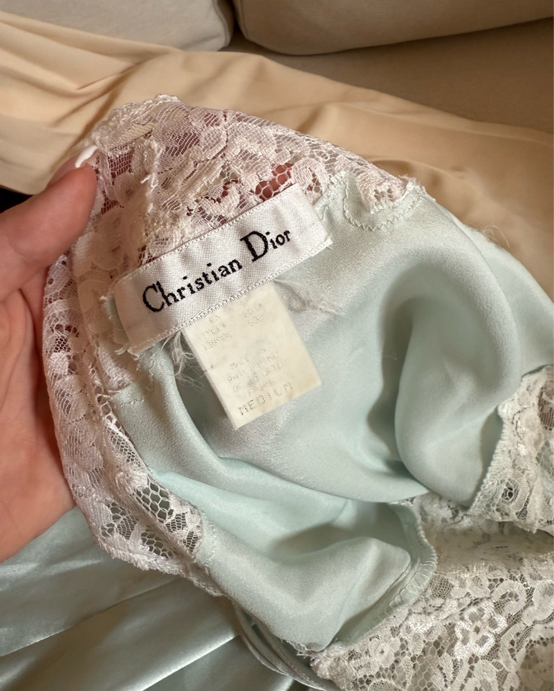 Vintage Christian Dior Satin Lace night gown sleep dress in light blue. Lace bodice and lace detail bottom. SO elegant and stunning! I wore this to get ready on my wedding day. I’m a size small so it fits small to medium! Perfect for brides, weddings, something blue.