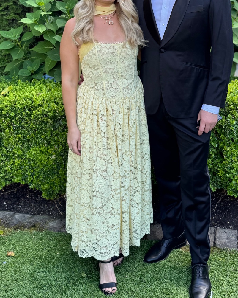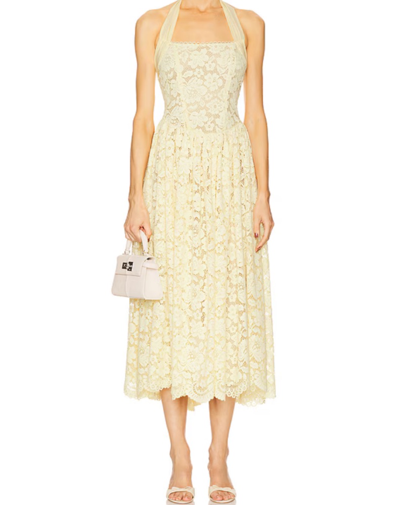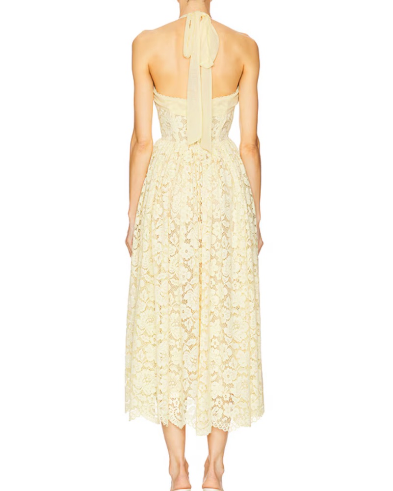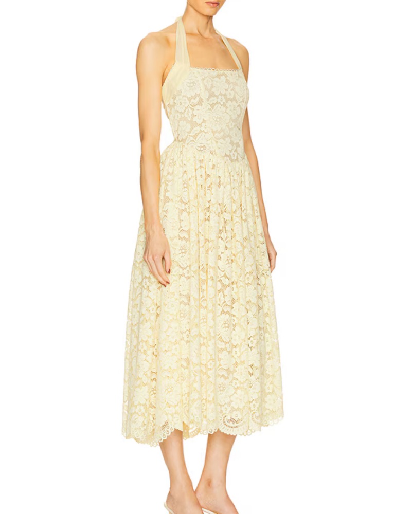 Can be styled as a halter or a wrap around neckline! Gorgeous butter yellow lace dress, perfect for weddings or dressy occasions ✨ Retails $400.