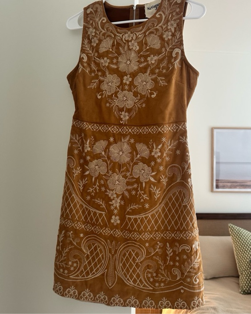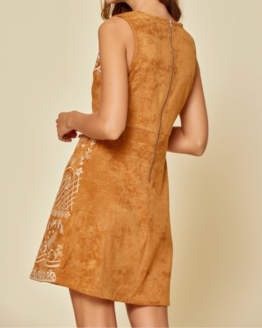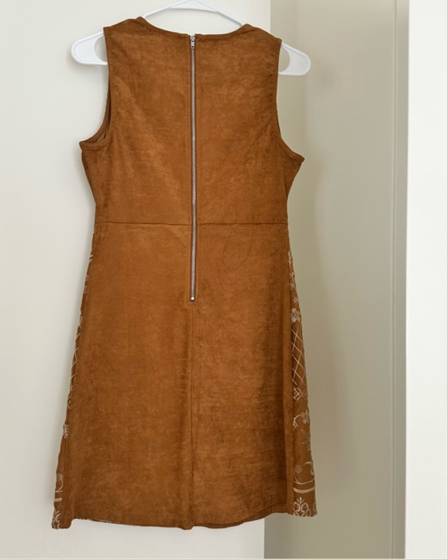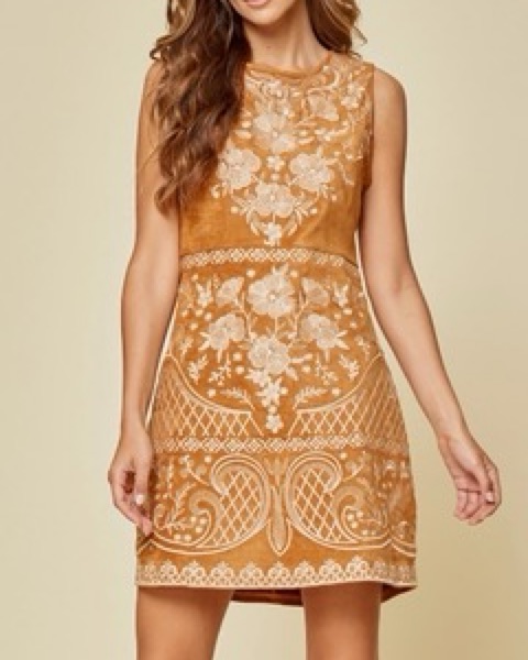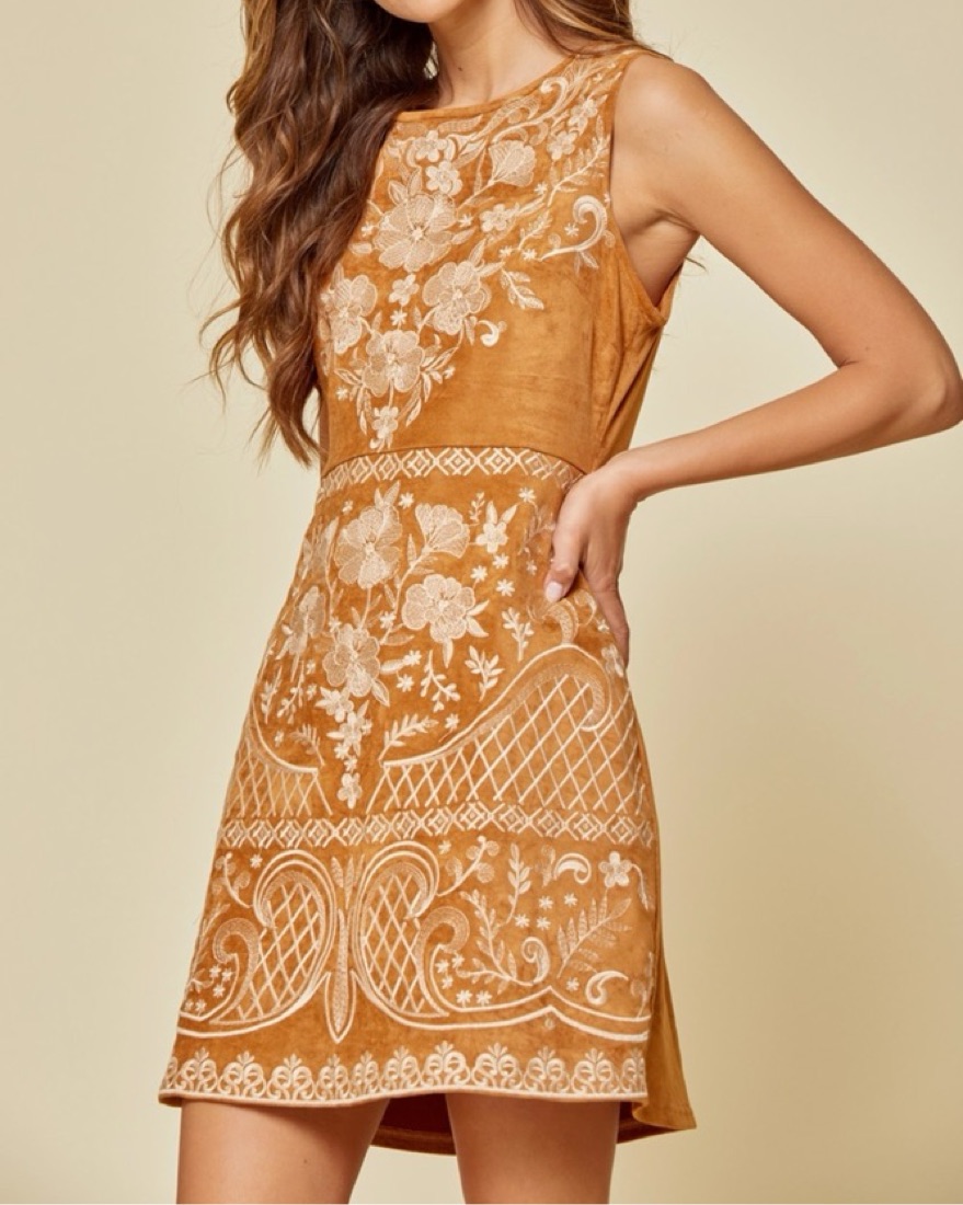 This stunning dress is perfect for a bohemian-inspired event or casual summer outing. The soft faux suede fabric and intricate embroidered details add an elegant, elevated touch to this versatile piece.