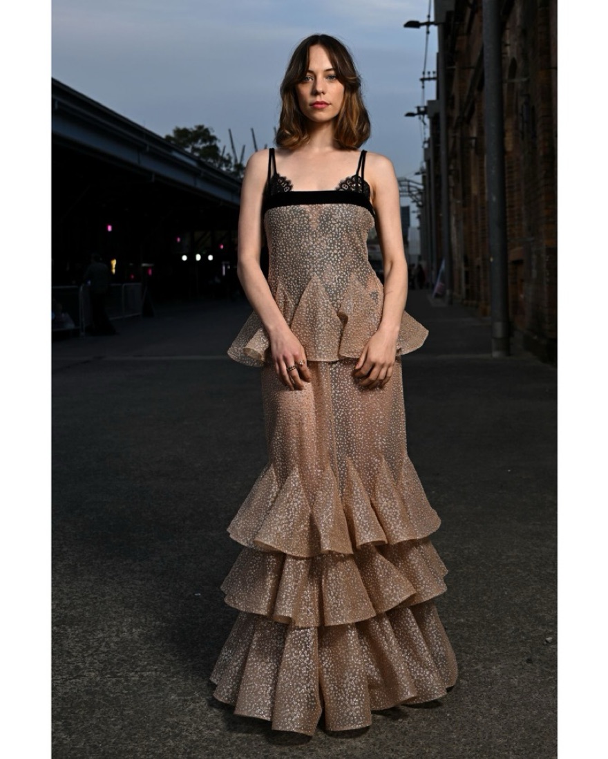 Finished in a shimmering effect, this champagne gown from the fav Aussie label showcases a feminine fluttered slip silhouette. AU size 1 (please know your size in Zimmermann).