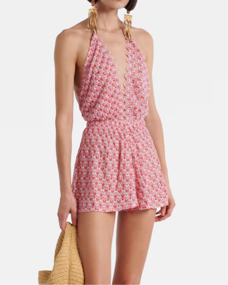 Missoni open-knit halter playsuit in a rare honey yellow colorway. Photos shown online are of the red version, but the item you’ll receive is yellow—a warm, golden shade perfect for summer vacations, beach days, and resort wear. Lightweight, breezy, and ideal as a beach cover-up or styled for warm-w