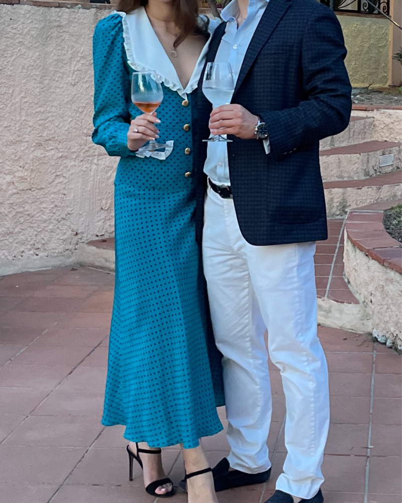 This chic polka dot dress is perfect for a special occasion. The puff sleeves and ruffle details add a feminine touch, while the midi length creates a flattering silhouette.