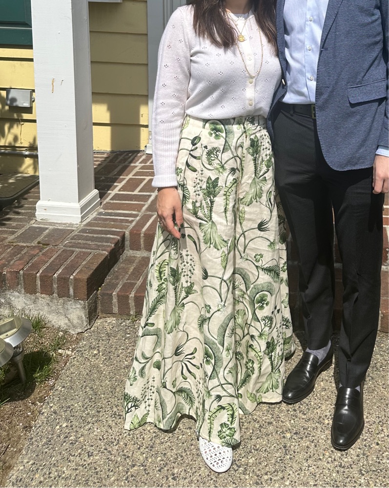 Off-white linen/flax all-over floral print concealed front fastening two side slit pockets palazzo design size S. I’m 5’2’ and they have been shorted to wear with flats.