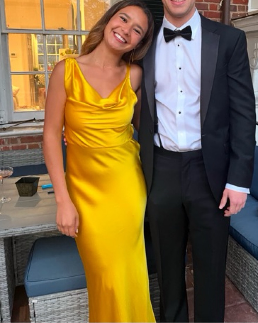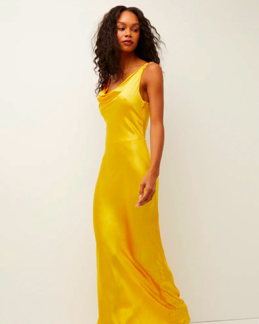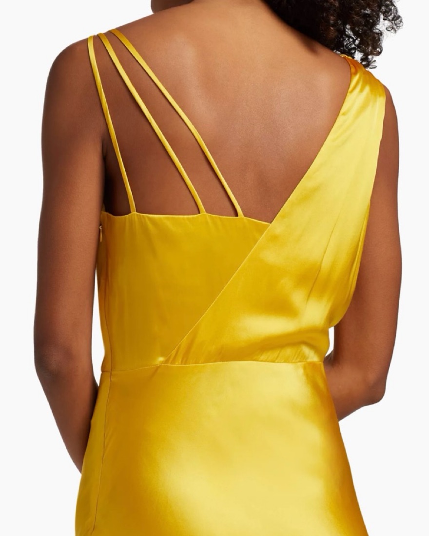 Veronica Beard Sanderson Dress in Bright Sunset. This dress is a silk blend, cowl neck, with a strappy back design. It is fully lined and has a hidden side zipper enclosure.