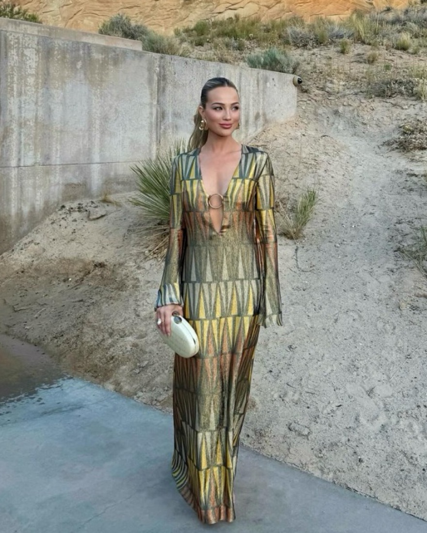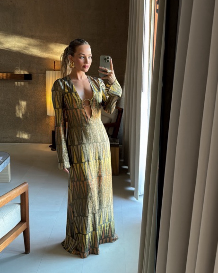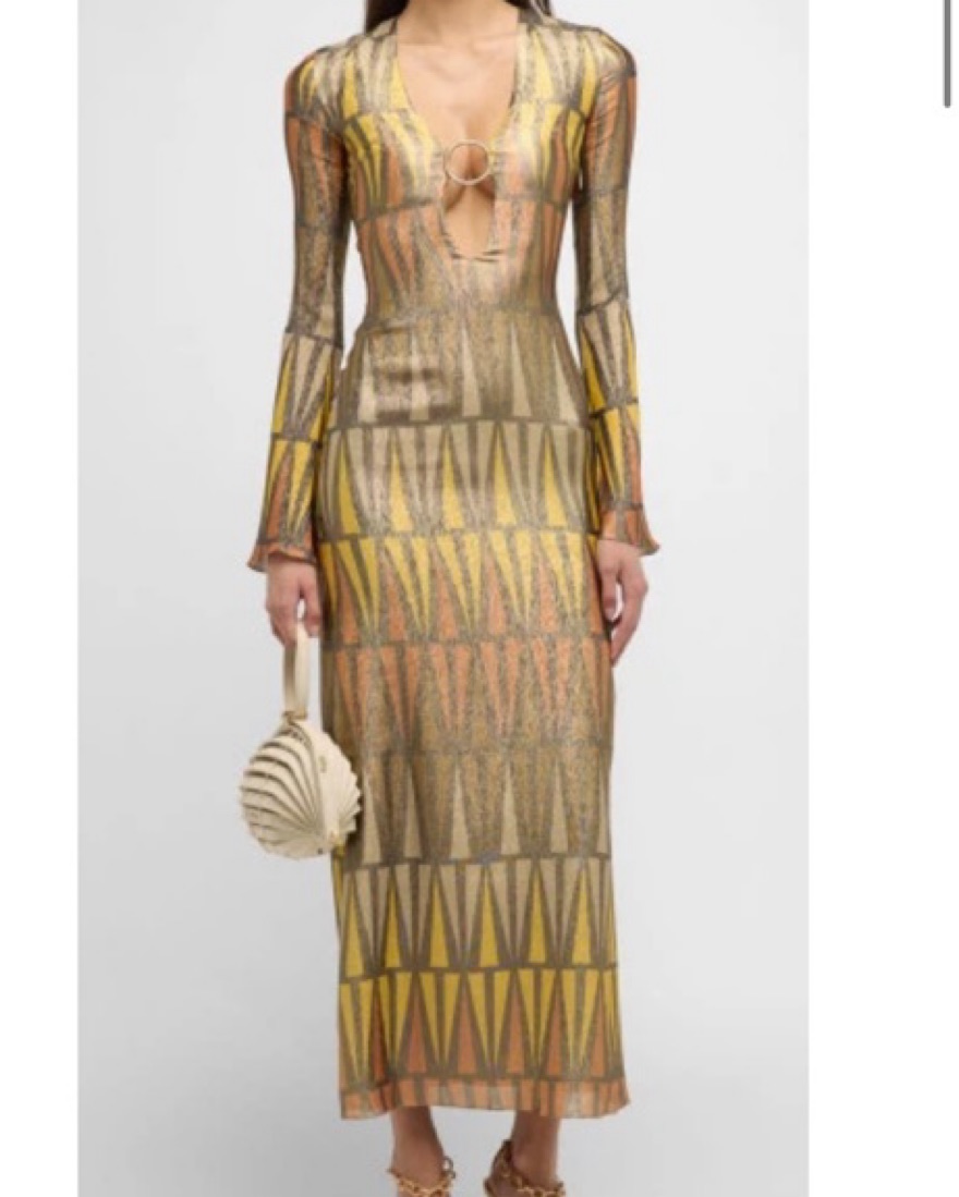 Adriana Iglesias "Bonnie" stretch-silk midi dress featuring a plunging V neckline with a gold-tone metal ring in an allover metallic print Long flared sleeves Column silhouette Hem falls below the knee Slipover style Silk/elastane Lining: Elastane/silk Made in Spain