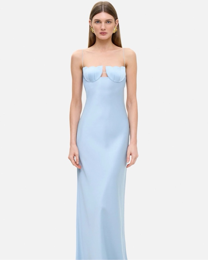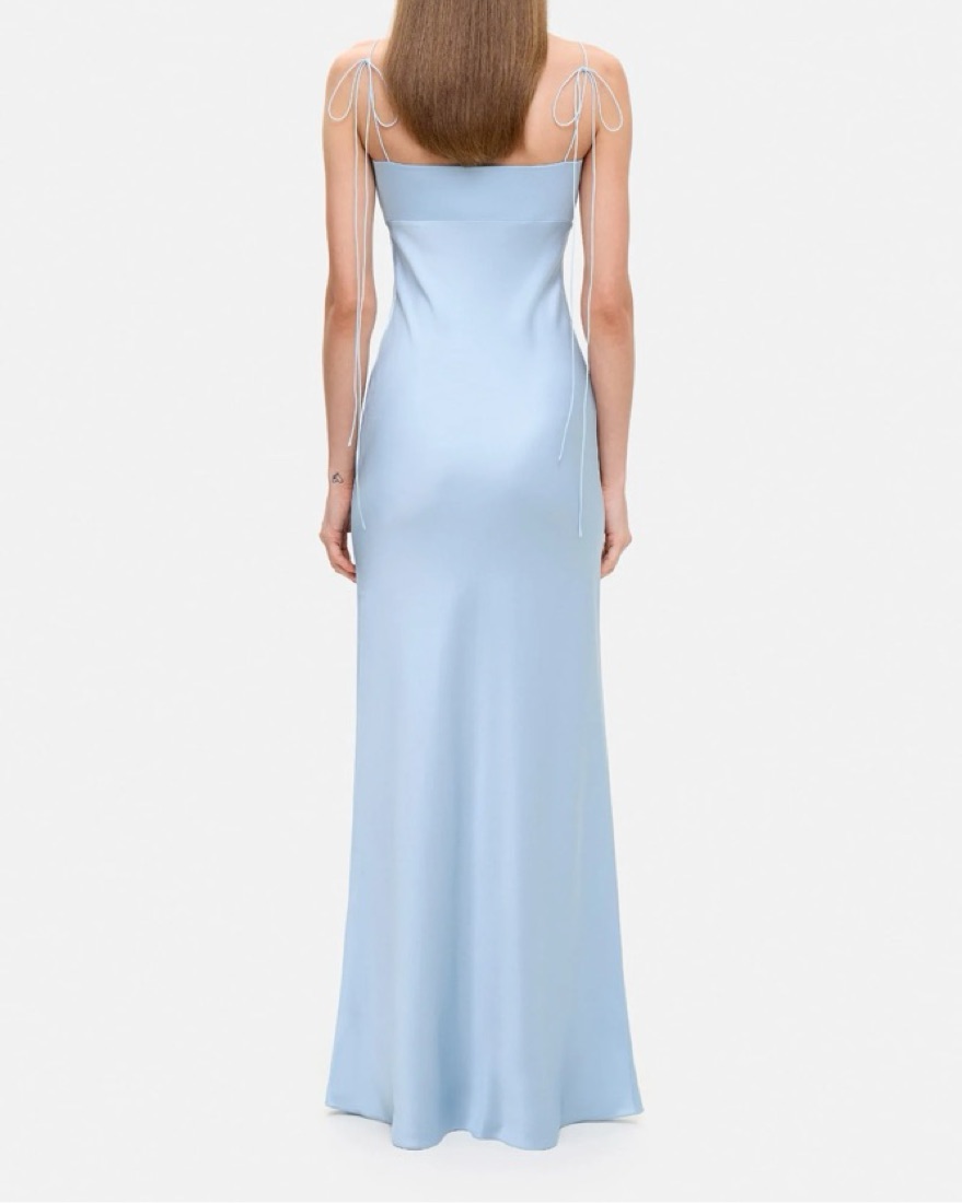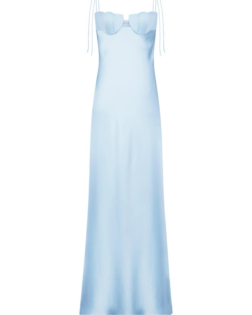 Fits TTS. The Tulip maxi dress with a floor-skimming skirt has a slip silhouette graced with a decorated bodice in the shape of tulip cups suspended from delicate self-tying straps. The gown is made from a lustrous satin.