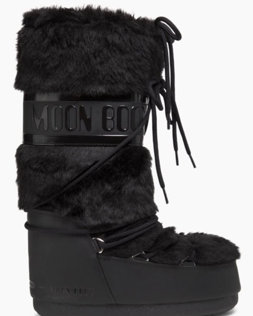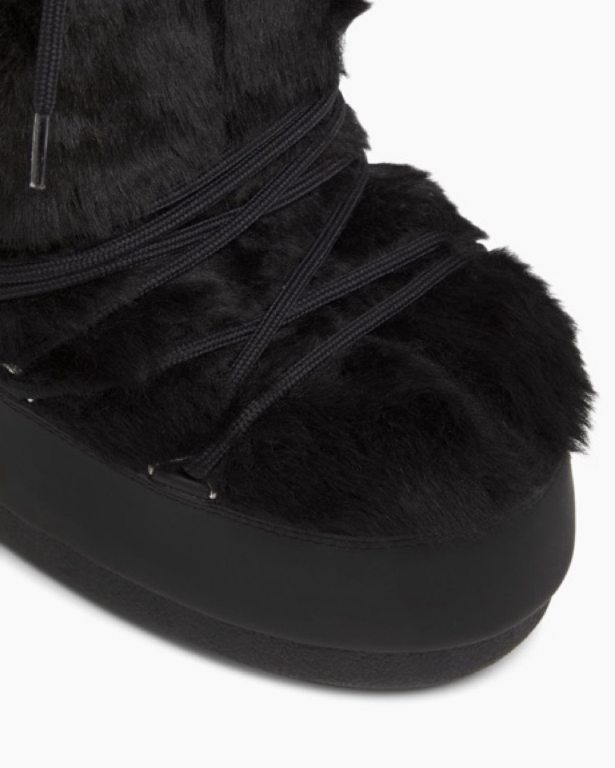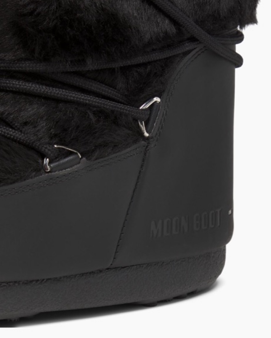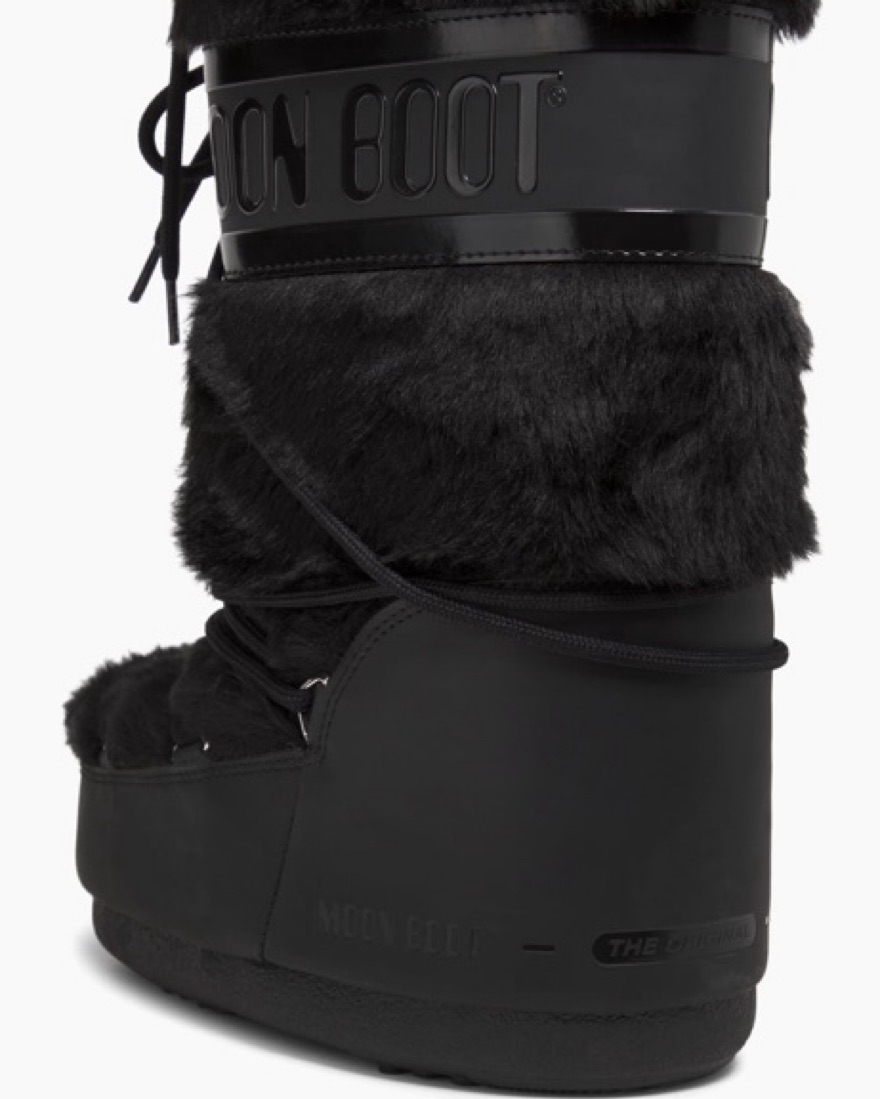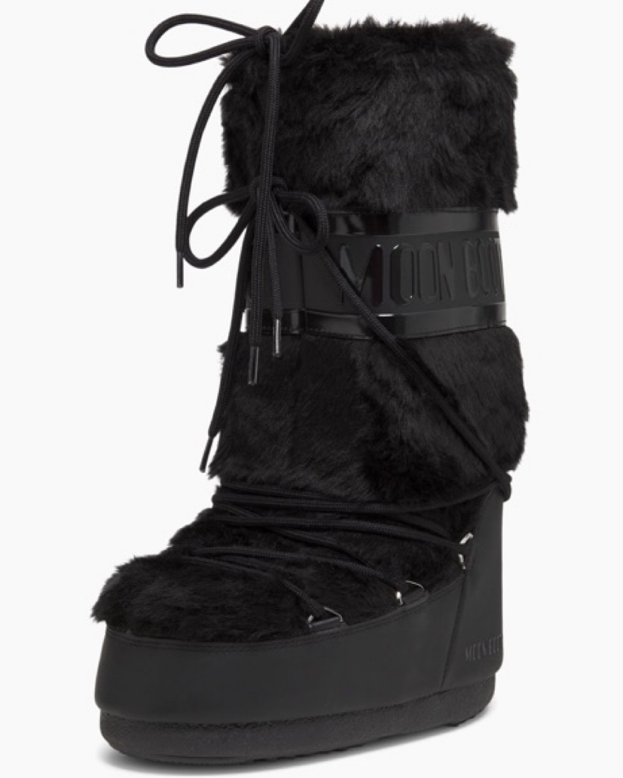 Icon Faux fur Moon Boot in black. Fits sizes 8-9.5 and versatile to wear on either foot. The fur is subtle with a little extra flare. Perfect for your Apres ski ventures