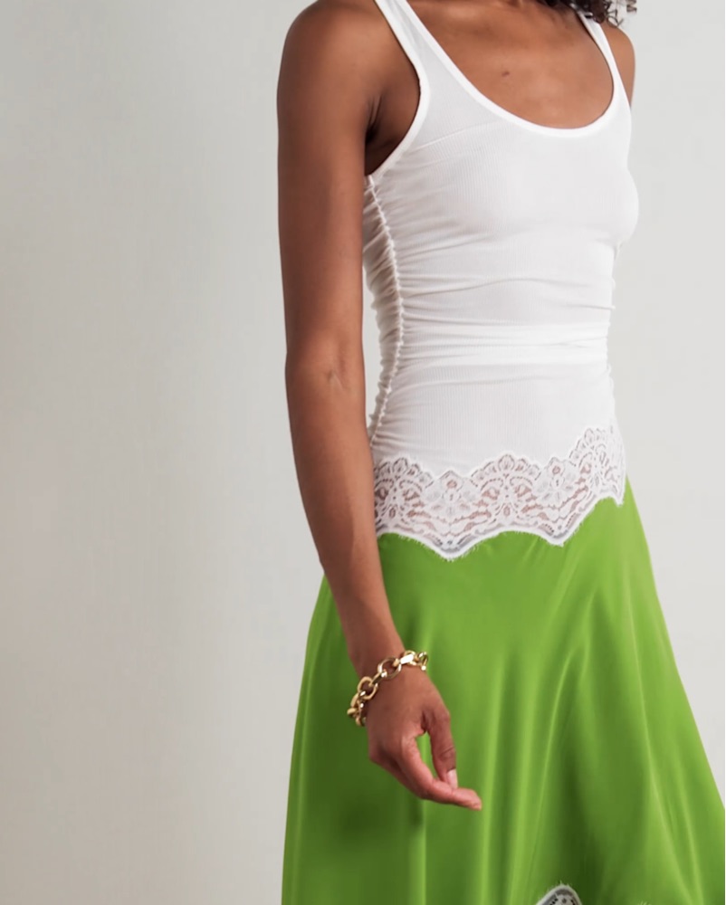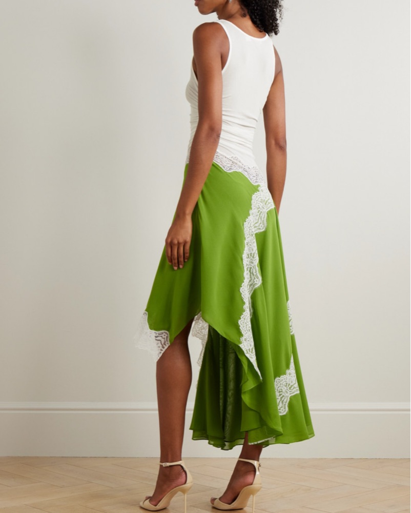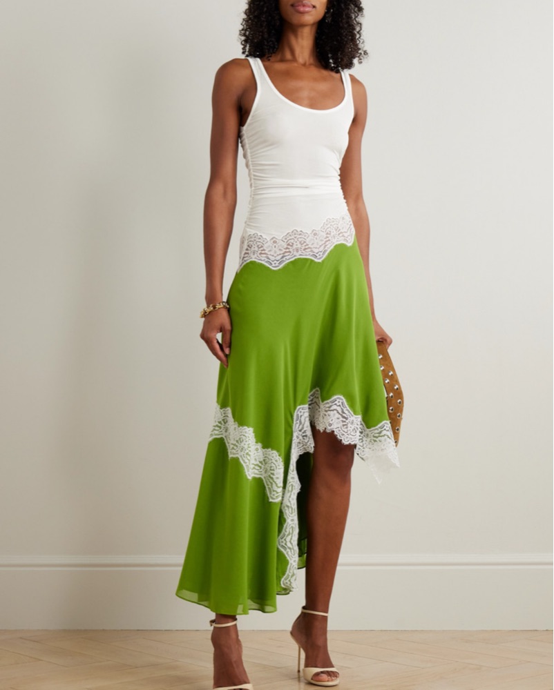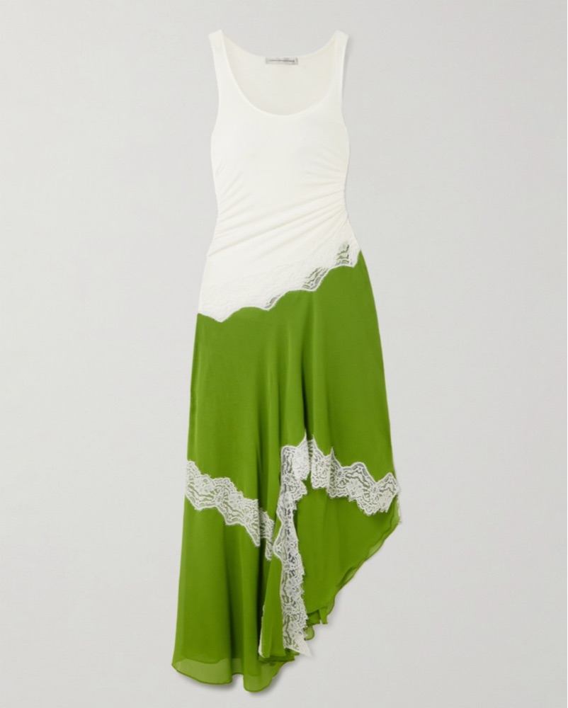 UK 6, brand new without tags, sold out online - NET-A-PORTER exclusive. Christopher Esber's Fall '25 collection. Designed to look like separates, this dress has a ruched stretch-jersey bodice that resembles a tank and an asymmetric crepe skirt with lace trim.