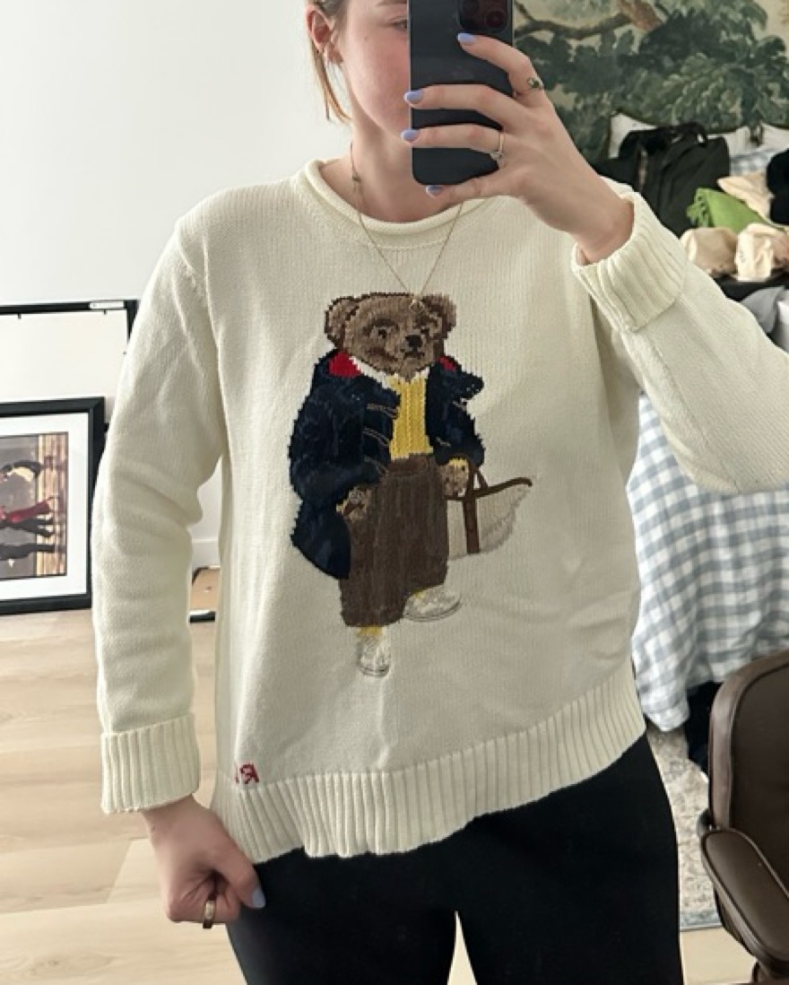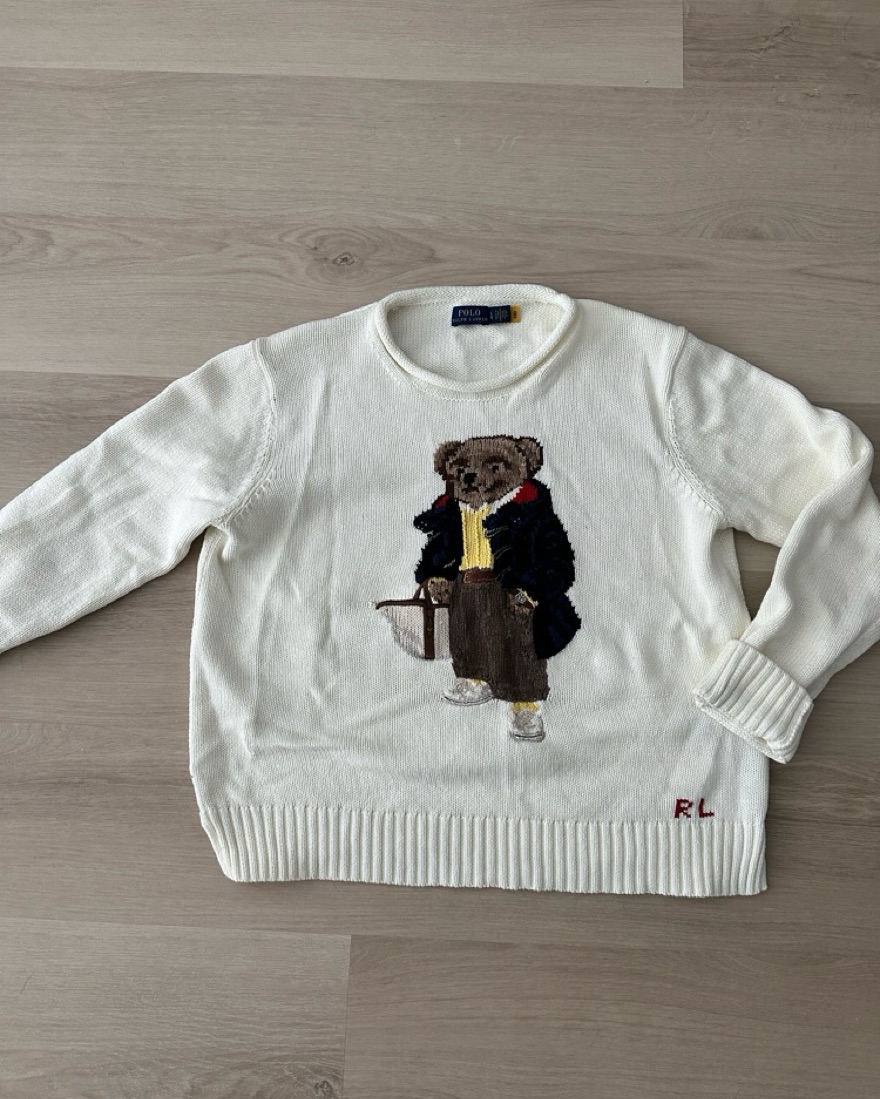Perfect for nautical weekends/vibes. Fits like a L. This charming sweater features an adorable teddy bear design, perfect for a cozy and whimsical winter look.