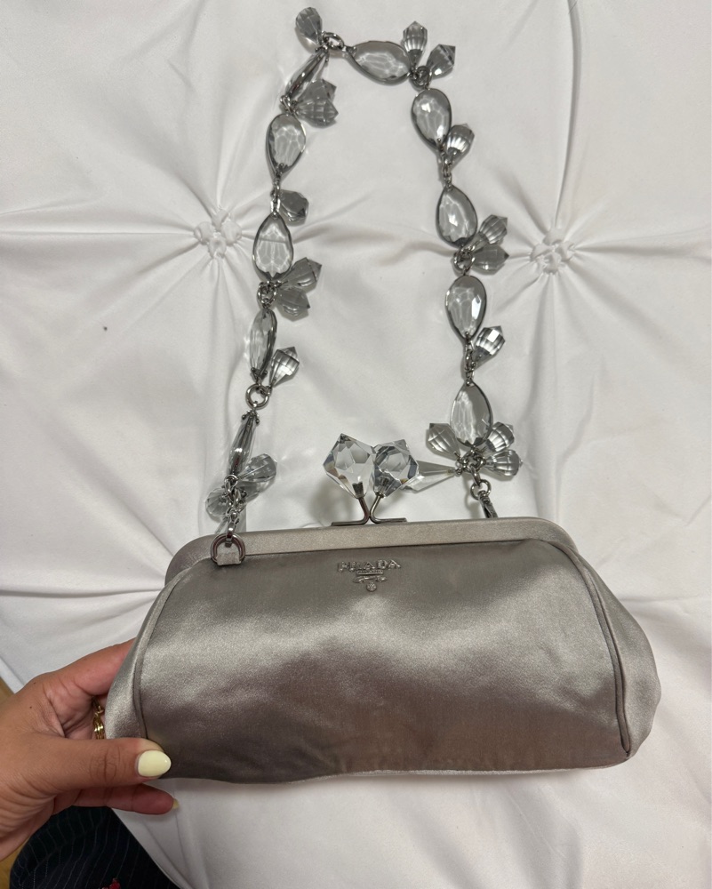 This bag is truly iconic! I purchased for my bridal era and have kept it around to use for weddings/formal events. The combination of the silver satin and the crystals is absolutely stunning! It is meant to be worn over the shoulder or you can detach the strap and wear it as a clutch.