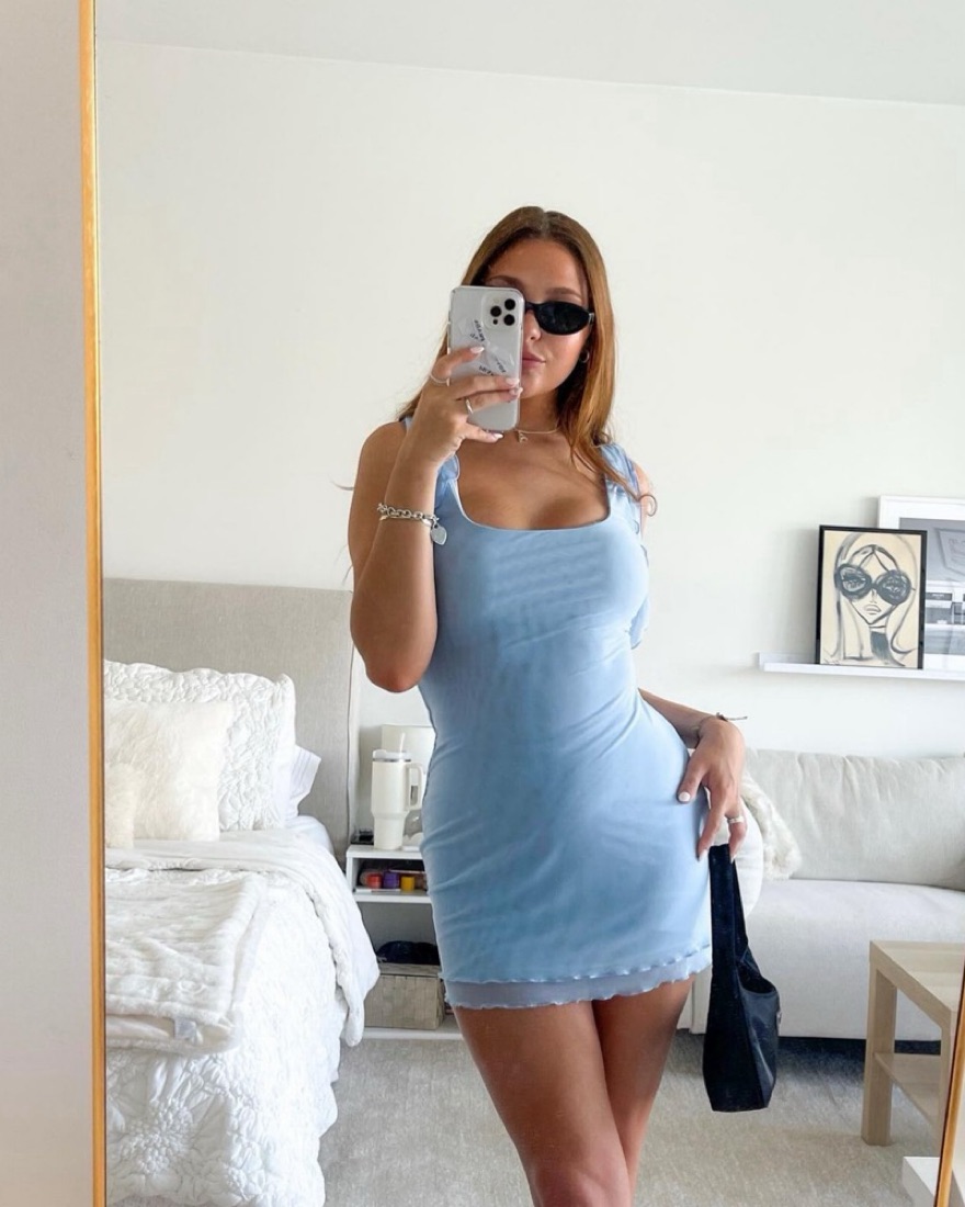 light blue comfortable mini dress with ruffle details on the straps, open back