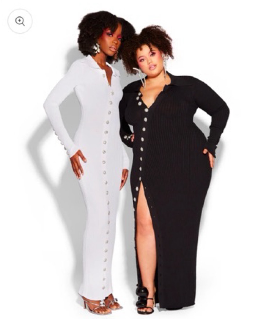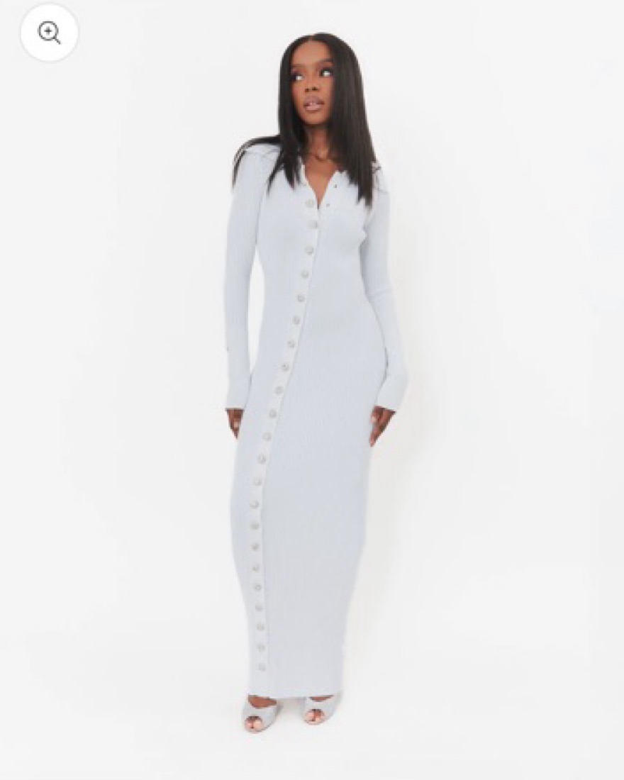 Embellished crystal buttons, asymmetric, ribbed knit maxi dress.