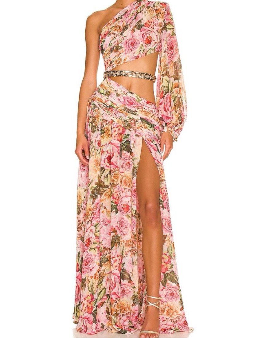 Floral gown with a side cut out, one sleeve, and front slit! Can be XS or small!