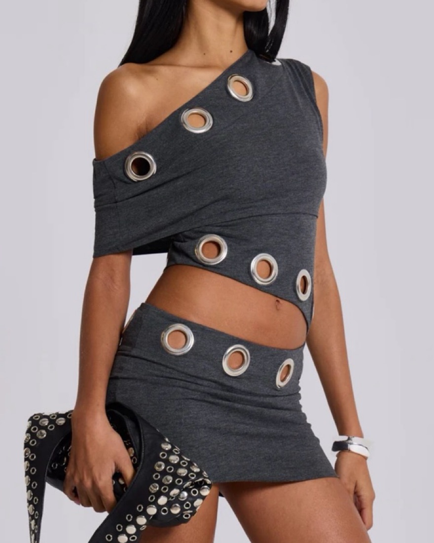 Super cool asymmetric dark grey marl jersey dress with oversized eyelets and a cut out hip shape. SOLD OUT ON WEBSITE!!
