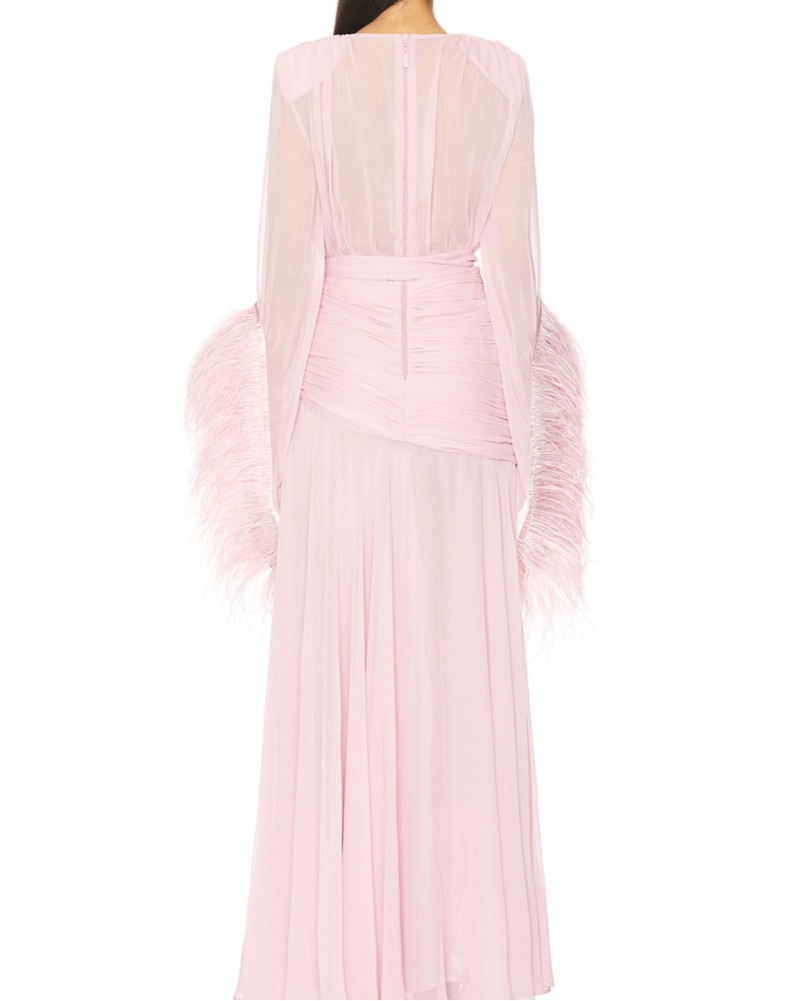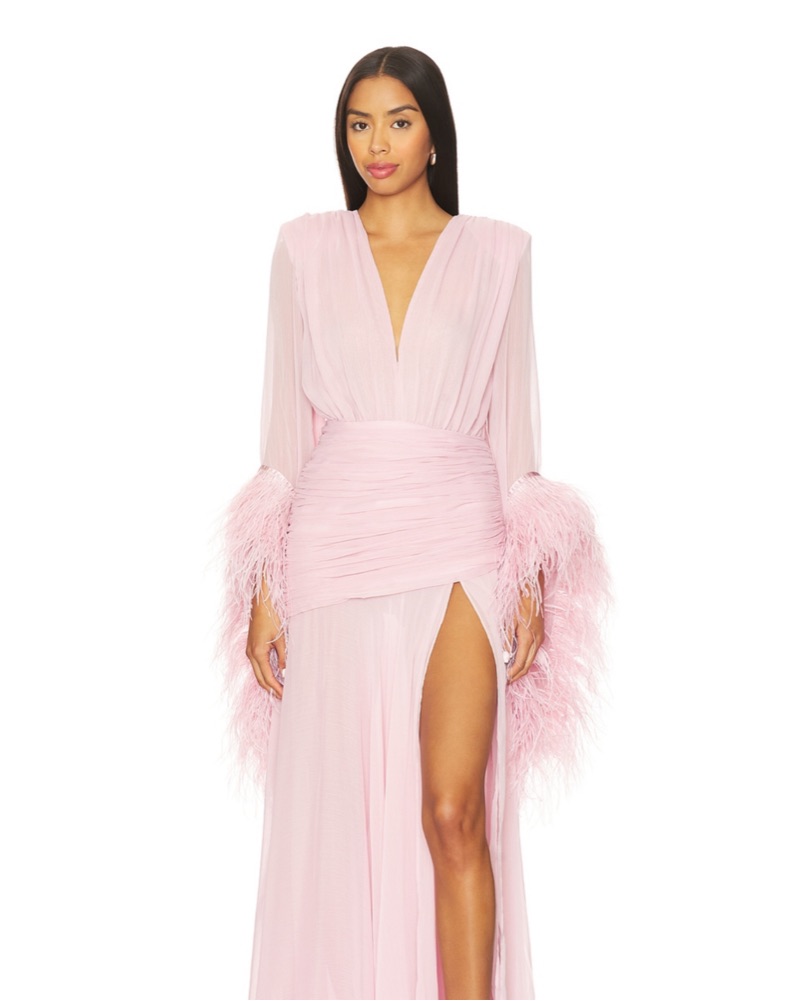 Gorgeous dress with feather details! Please be mindful of spray tans so as not to get it on the dress 🫶
