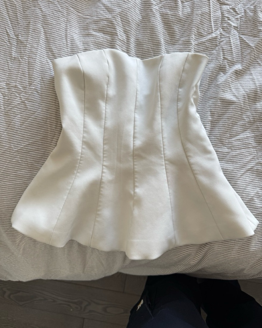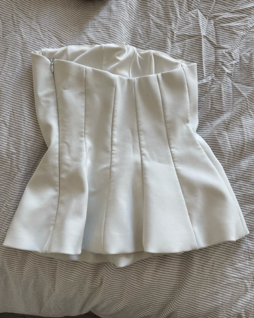 White strapless top, flare at bottom. Secure, comfortable perfect day/ night top.