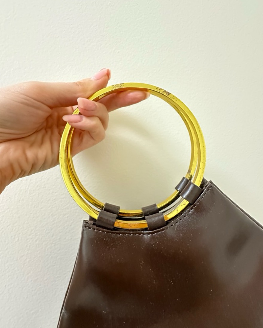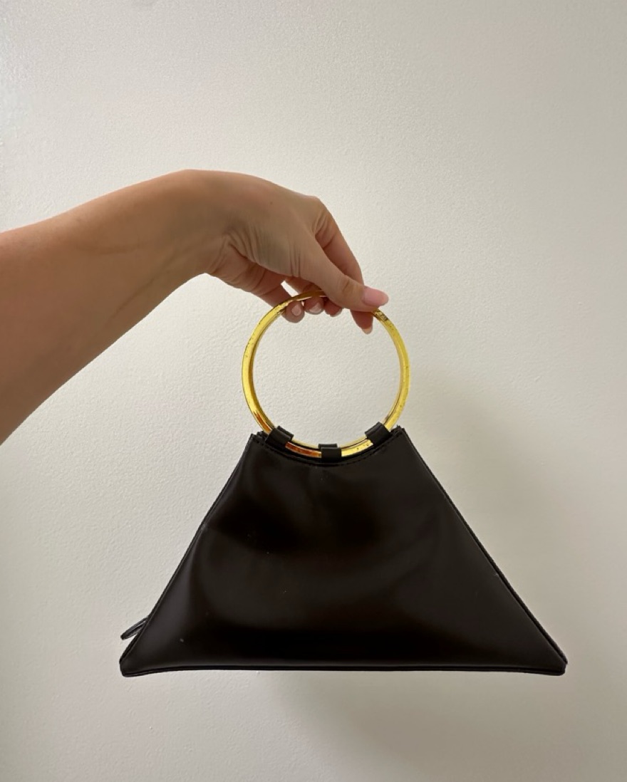 Super cute structured triangle hand bag that i thrifted! Some slight tarnishing on the handle, but not noticible when wearing. Color is a chocolate brown with gold hardwear and zip closure. Ill preface the bag doesnt fit much!